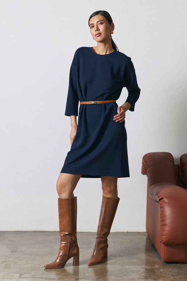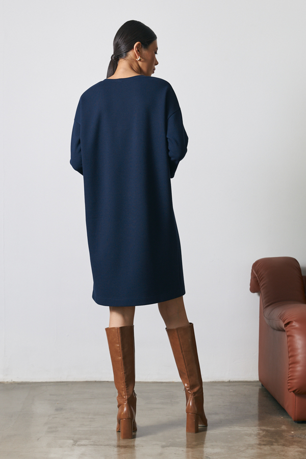 Платье свободного силуэта выполнено из эластичного полотна. Изделие со спущенной линией плеча и длинным рукавом. Вырез горловины оформлен бейкой из основной ткани. В таблице размеров представлены параметры человека, а не изделия.