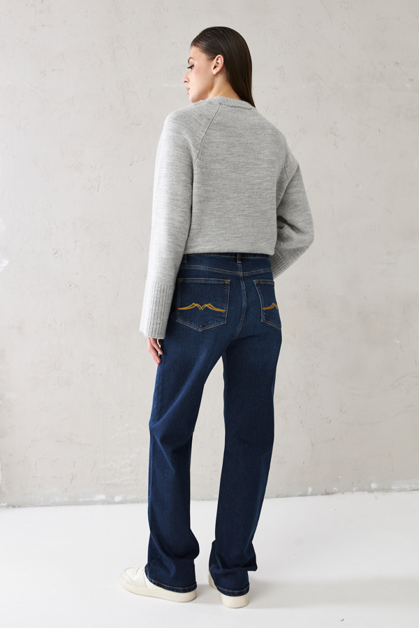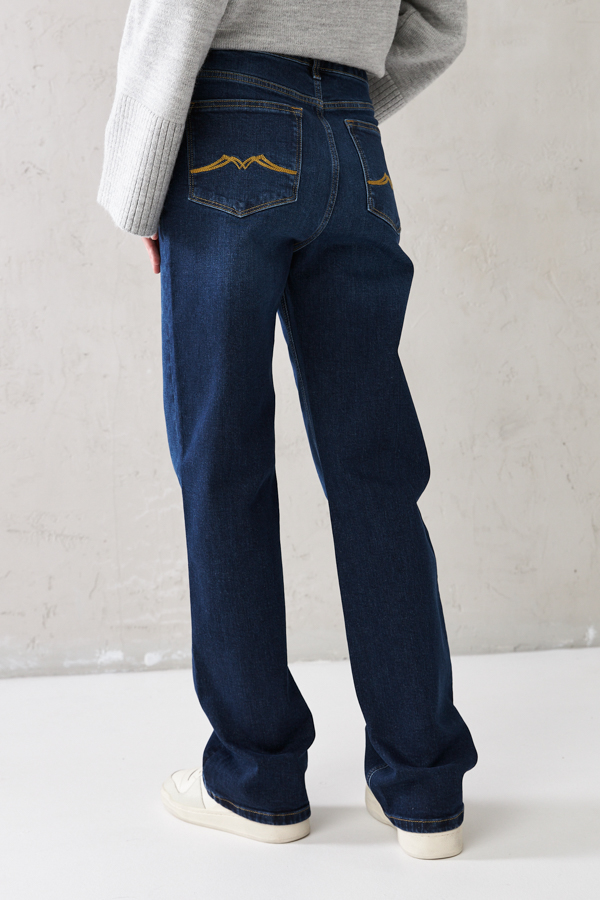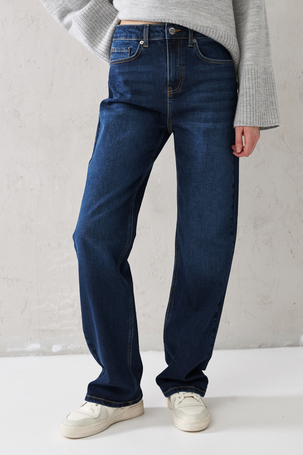 Брюки из эластичного денима выполнены по классической джинсовой технологии (варка с эффектом легкого выбеливания). Прямой классический крой. На задней части брюк выполнены накладные карманы, на передней - карманы с подкройным бочком. Притачной пояс со шлёвками. Застёжка на молнию-гульфик и пуговицу.