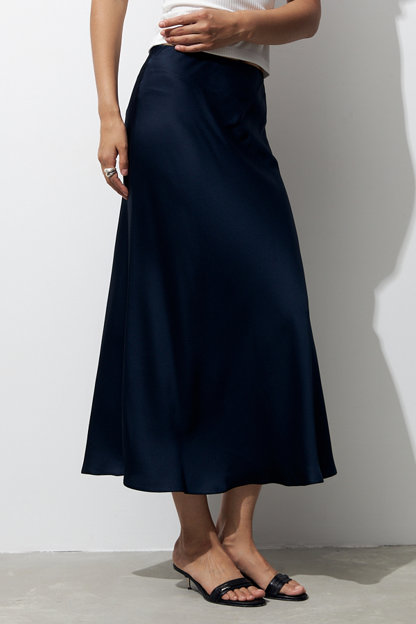 Юбка, расширенная книзу из вискозной ткани с сатиновым блеском. Крой юбки по косой, на линии талии скрытая резинка.