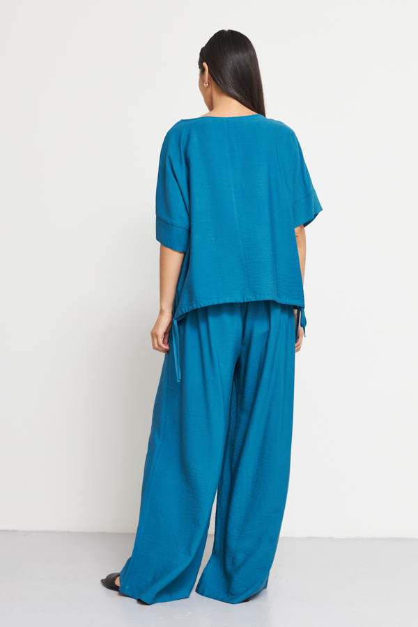 Блуза из вискозной ткани с крэш-эффектом. Очень свободный силуэт с небольшими разрезами по бокам. Круглый вырез горловины. Цельнокроеный рукав с притачной манжетой. Низ изделия затягивается на кулиску.