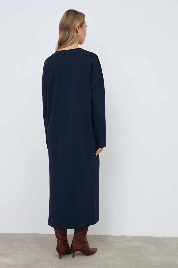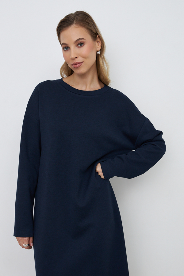 Платье из эластичного полотна свободного силуэта с разрезом в боковом шве. Изделие со спущенной линией плеча и длинным рукавом. Вырез горловины оформлен бейкой из основной ткани. В таблице размеров представлены параметры человека, а не изделия.
