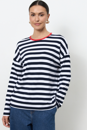 Джемпер из эластичного полотна. Свободный силуэт со спущенной линией плеча и длинным рукавом. Вырез горловины окантован эластичной бейкой. В таблице размеров представлены параметры человека, а не изделия.