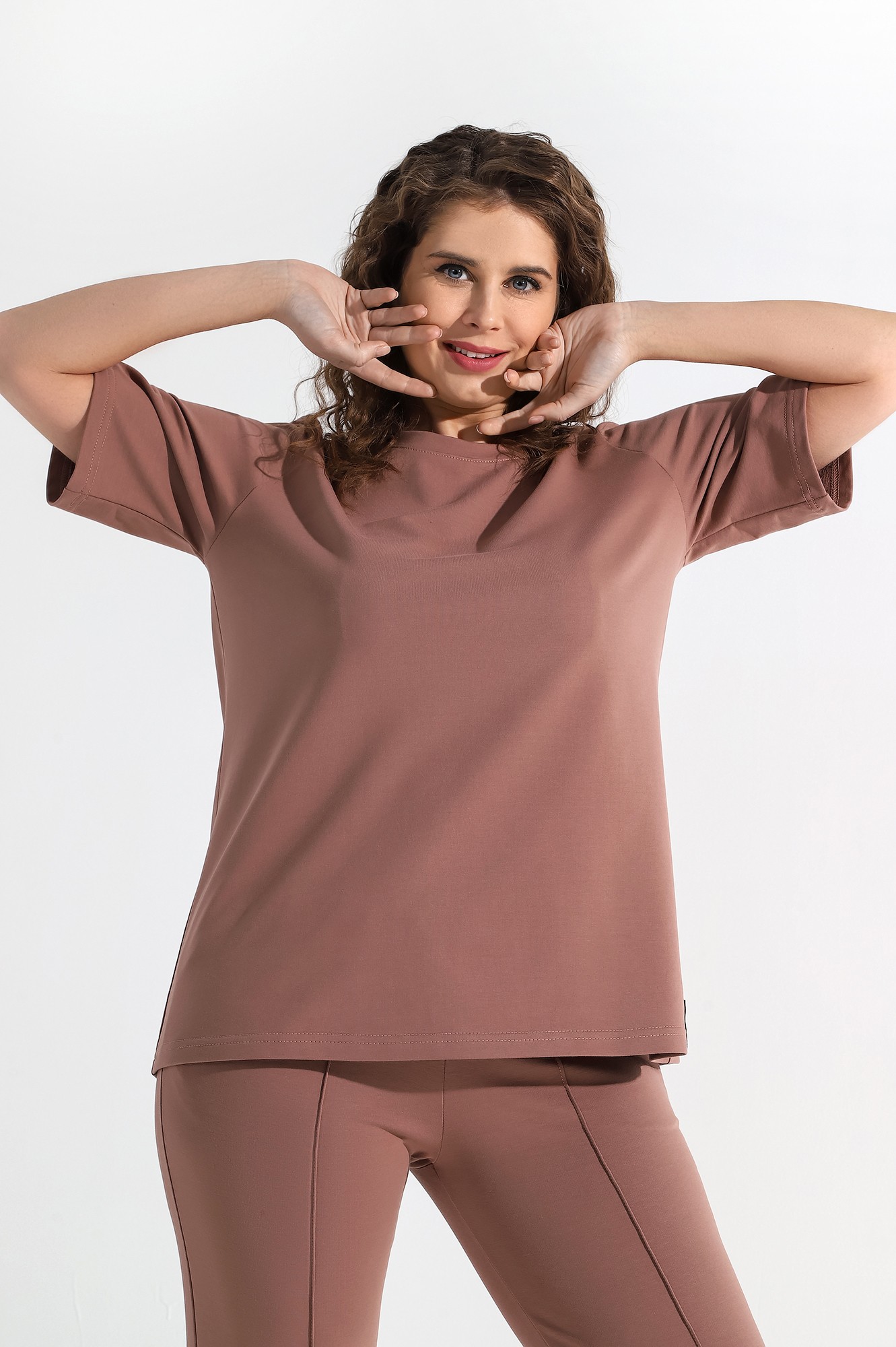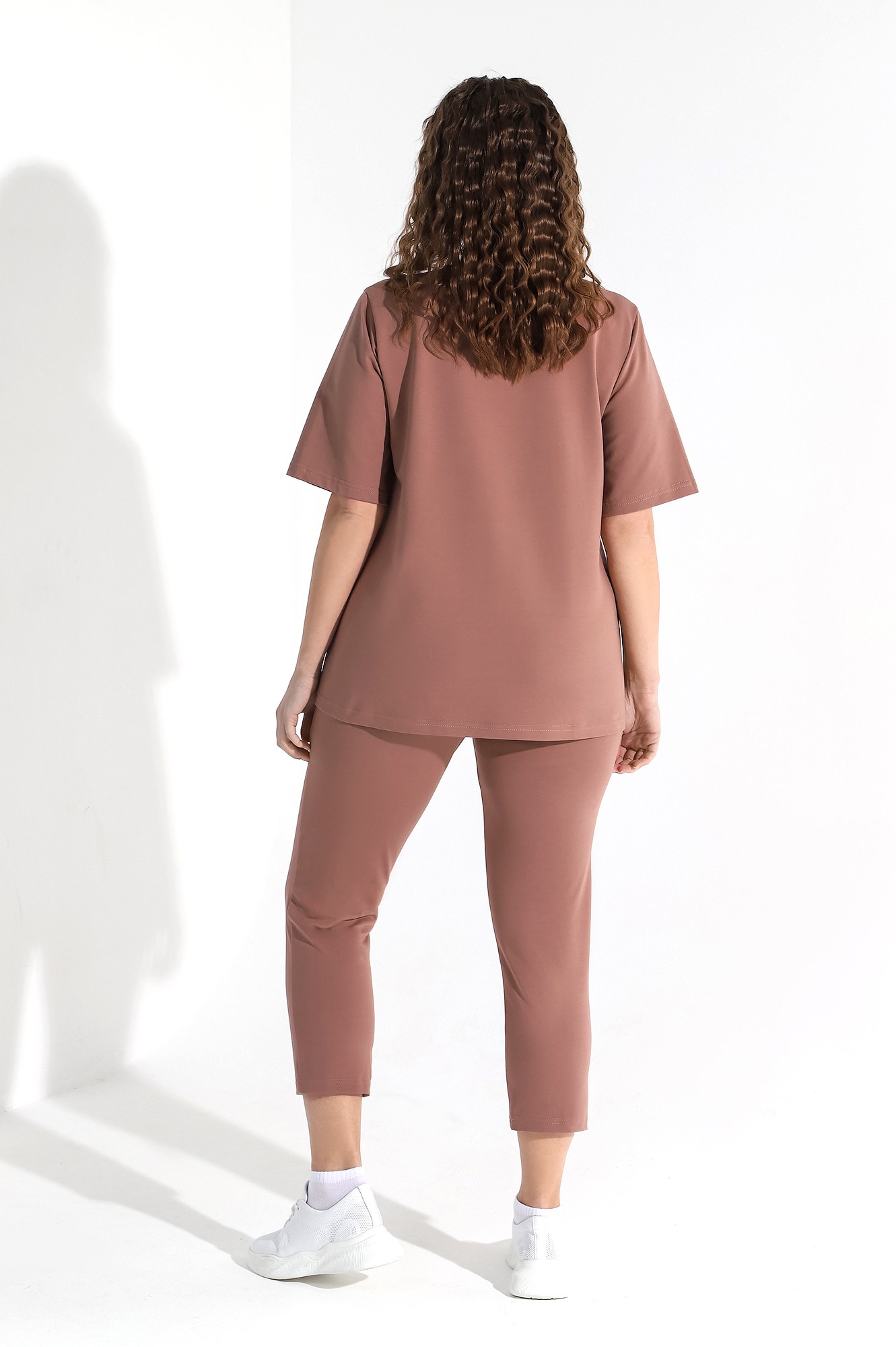 Костюм женский из гладкокрашеного трикотажного полотна футер-двунитка, состоящий из футболки и брюк. Футболка – классического покроя, с короткими втачными рукавами и горловиной овальной формы, обработанной втачной планкой. В нижней части полочки слева настрочен декоративный элемент прямоугольной формы.Брюки – длиной 7/8, слегка зауженные книзу, на притачном поясе с эластичной тесьмой внутри и карманами в боковых швах. Передние половины брюк застрочены по линиям центра вдоль на 0,3 см.