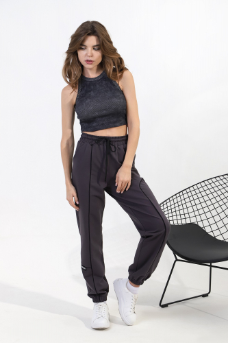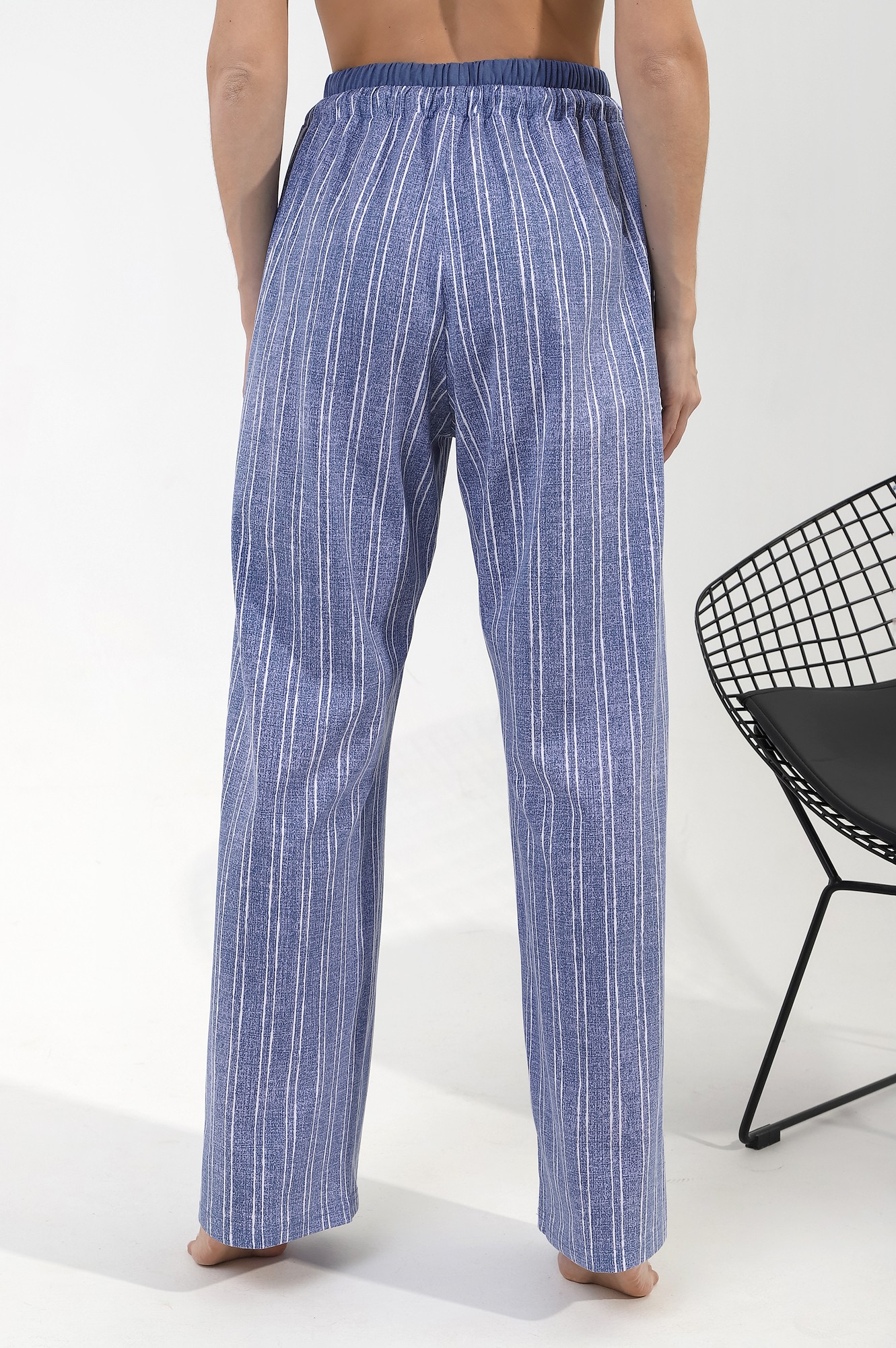 Брюки - молодежные из трикотажного полотна «кулирка» с набивным рисунком «полоска», длинные, свободные, на притачном поясе с эластичной тесьмой внутри, выполненным из двух видов ткани: с набивным рисунком и гладкокрашеной. В пояс вставлен декоративный шнурок, продетый через две обметанные петли в центре пояса.