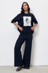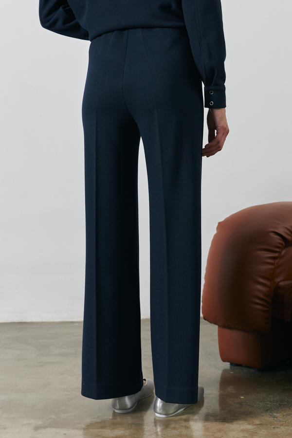 Брюки прямого силуэта из эластичного полотна. Пояс притачной с эластичной резиной. На передней части брюк застрочены стрелки.