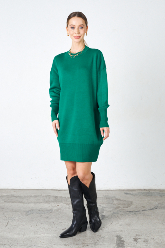 Костюм из джемпера и юбки с рисунком в узкий рубчик. Юбка прилегающего силуэта. Пояс с эластичной резиной. Джемпер свободного силуэта. Рукав втачной в спущенную пройму. Вырез горловины оформлен воротником-стойкой с отворотом. Изделие выполнено из мягкой структурированной пряжи.