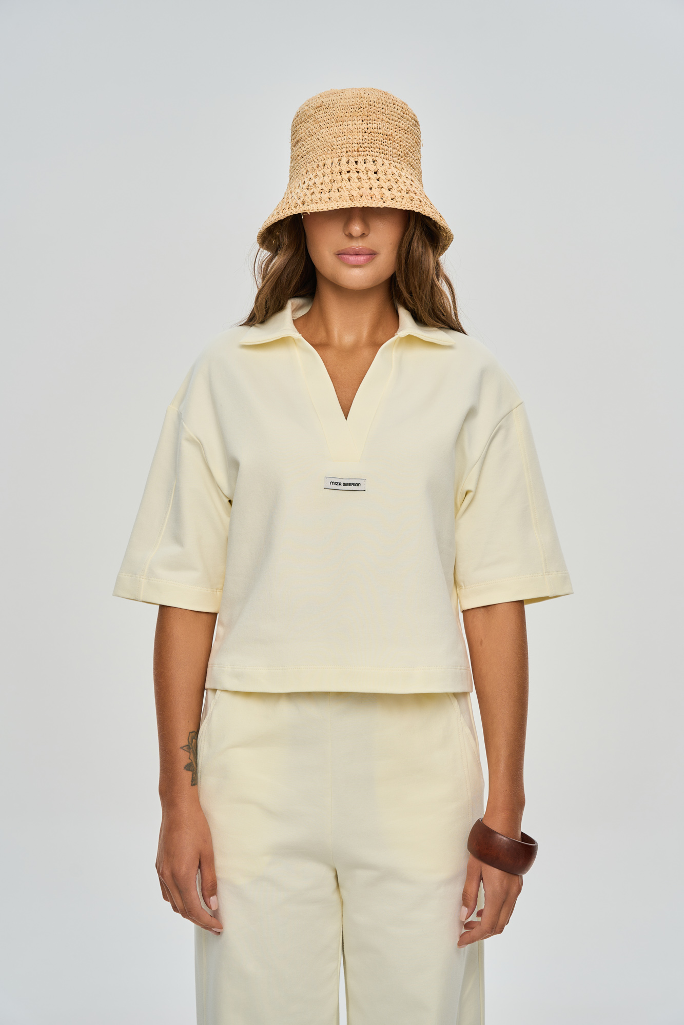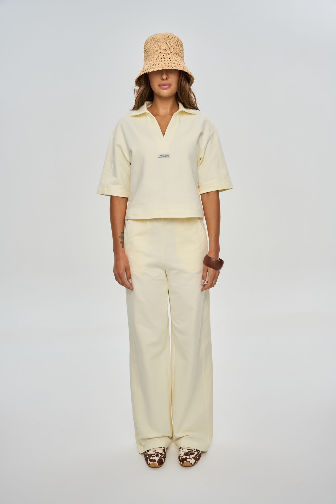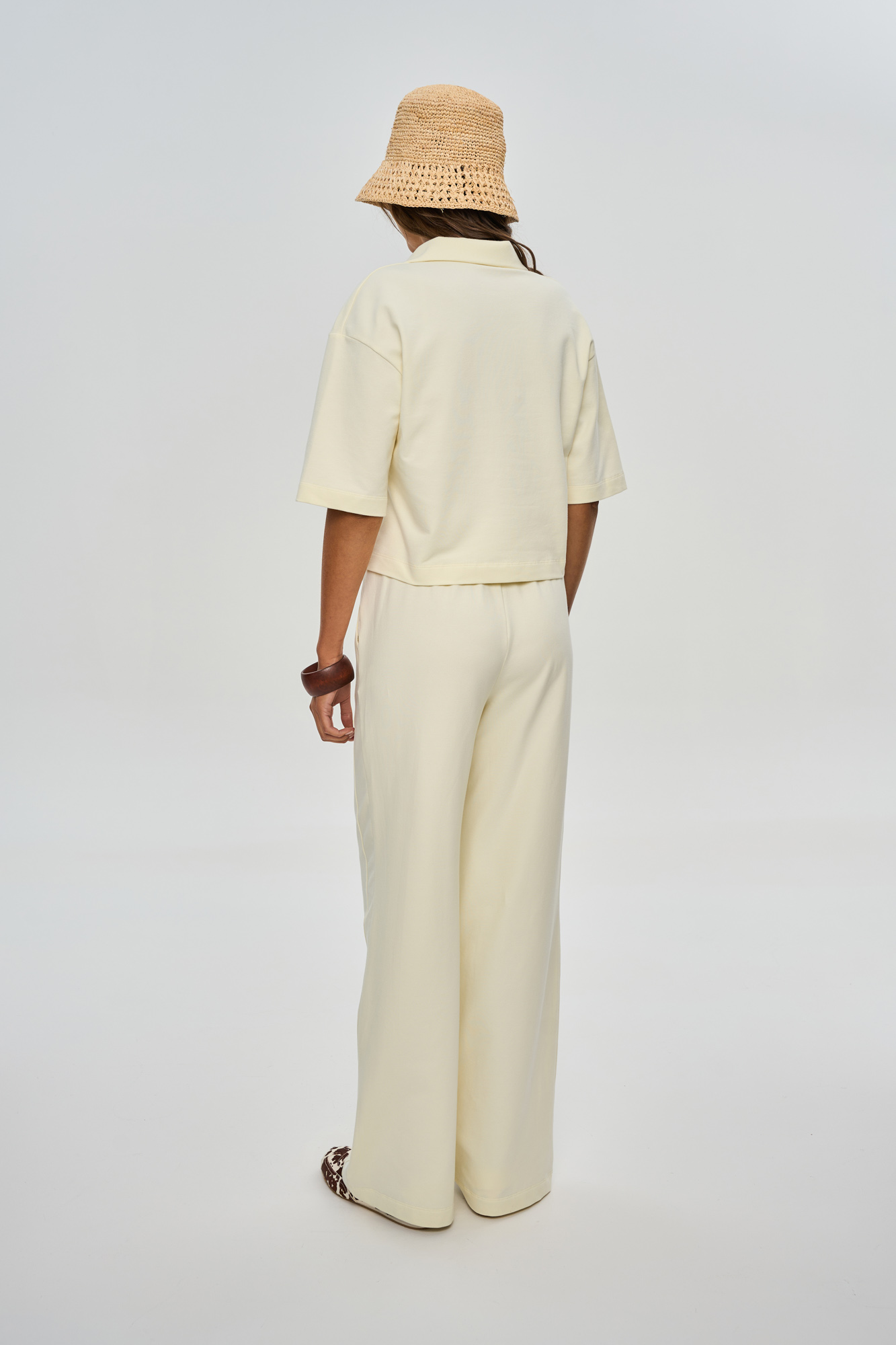 Состоит из укороченного свитшота свободного кроя с воротником и брюк-палаццо с отделочным швом.