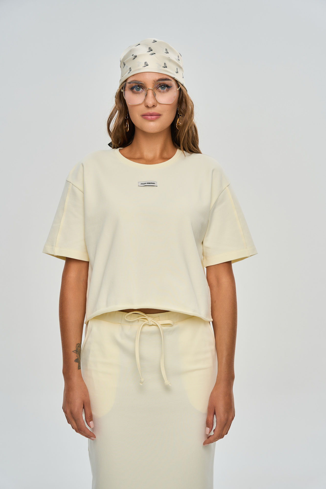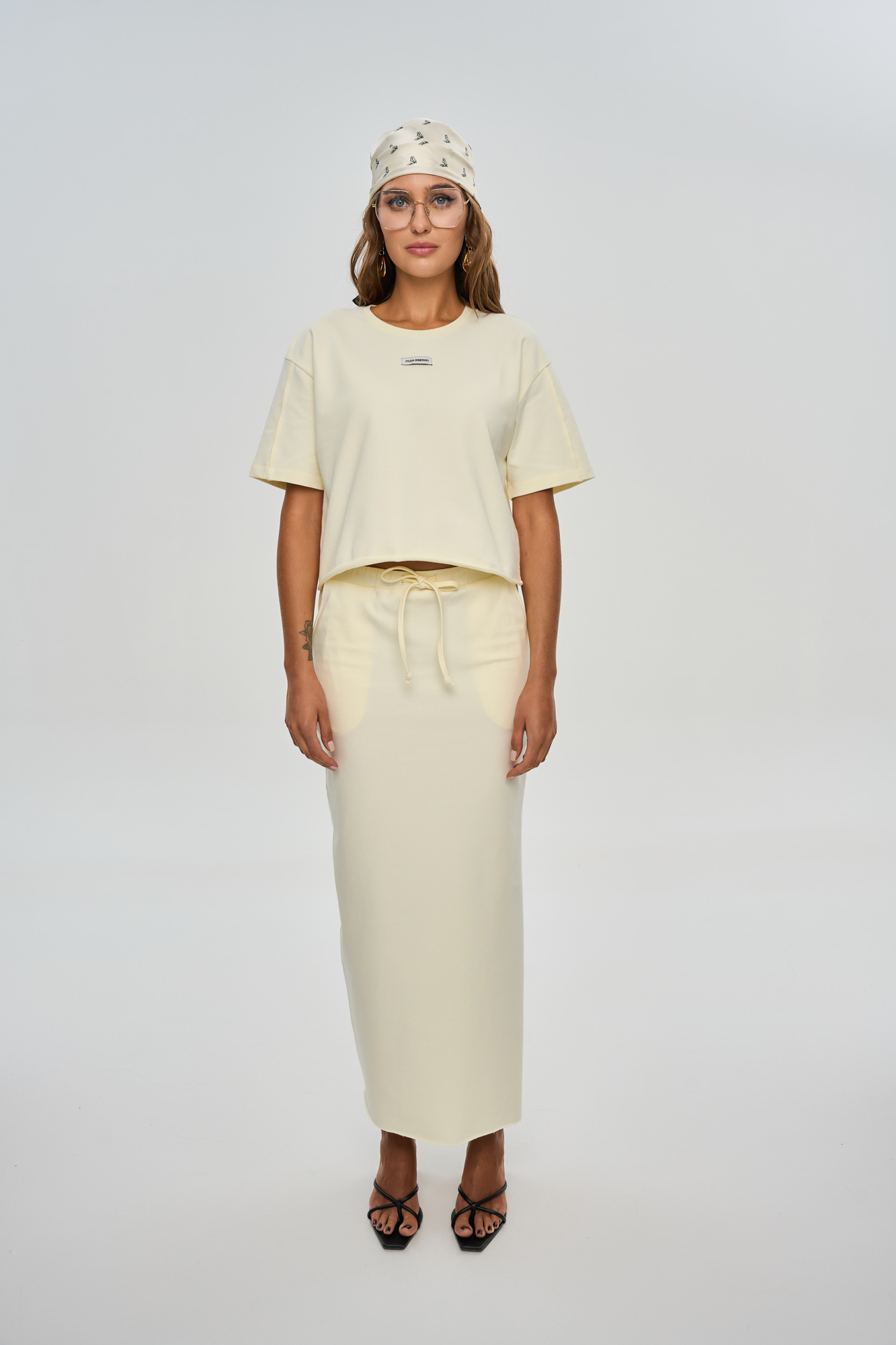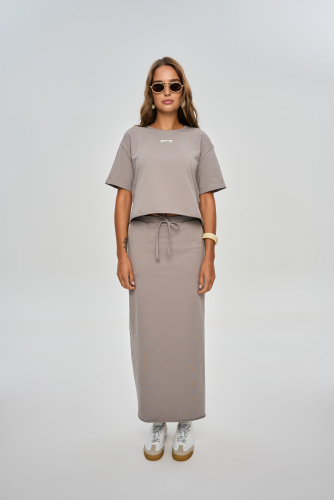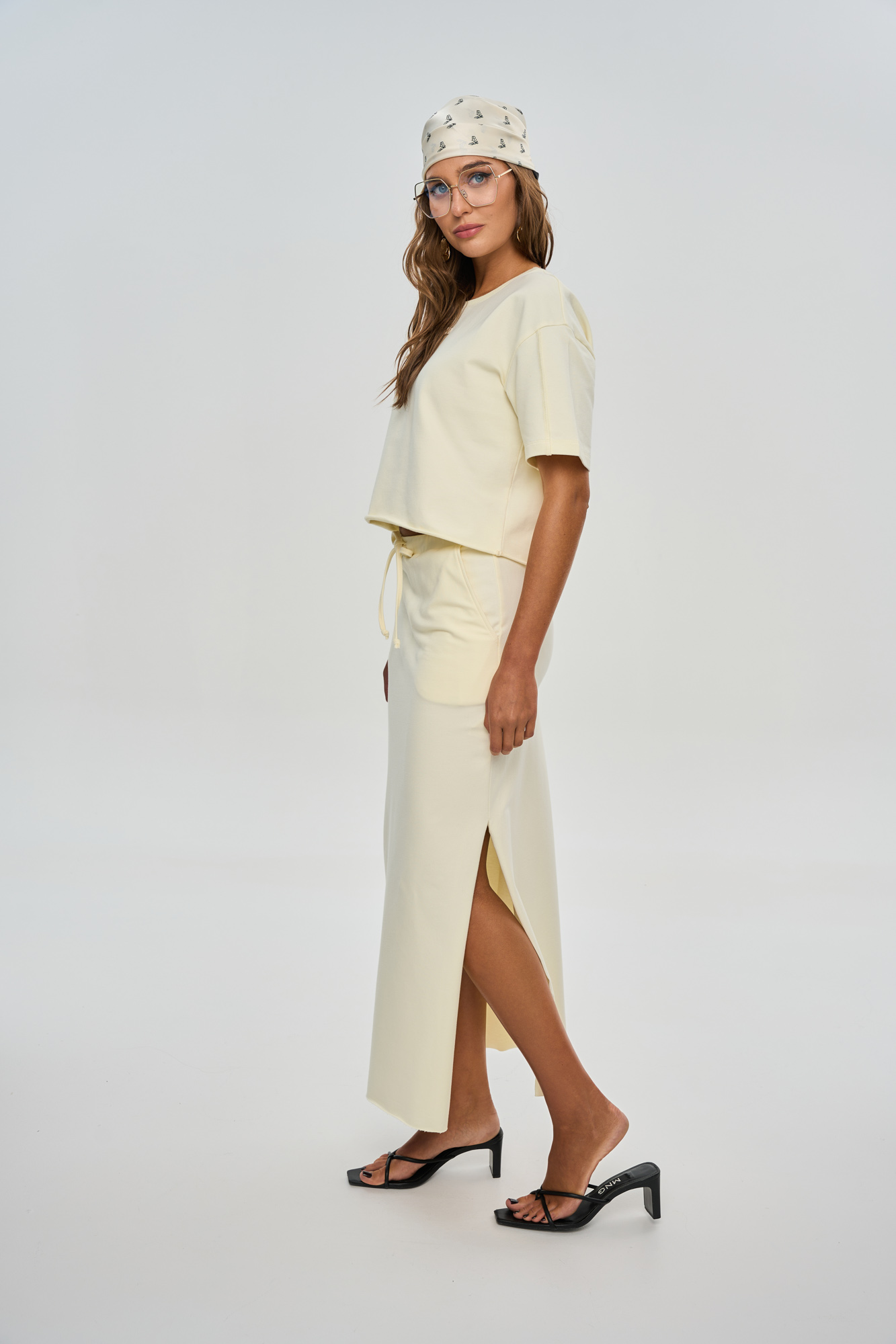 Состоит из укороченной футболки свободного кроя и прямой юбки в длине миди с высоким боковым разрезом с одной стороны.