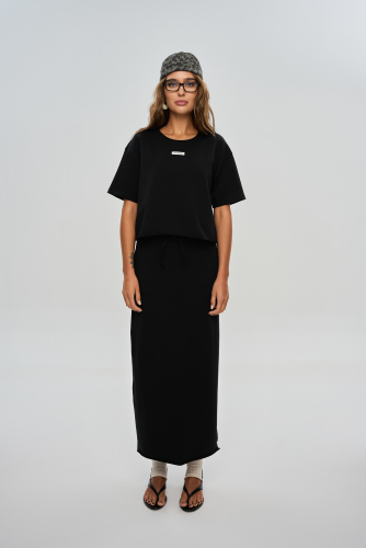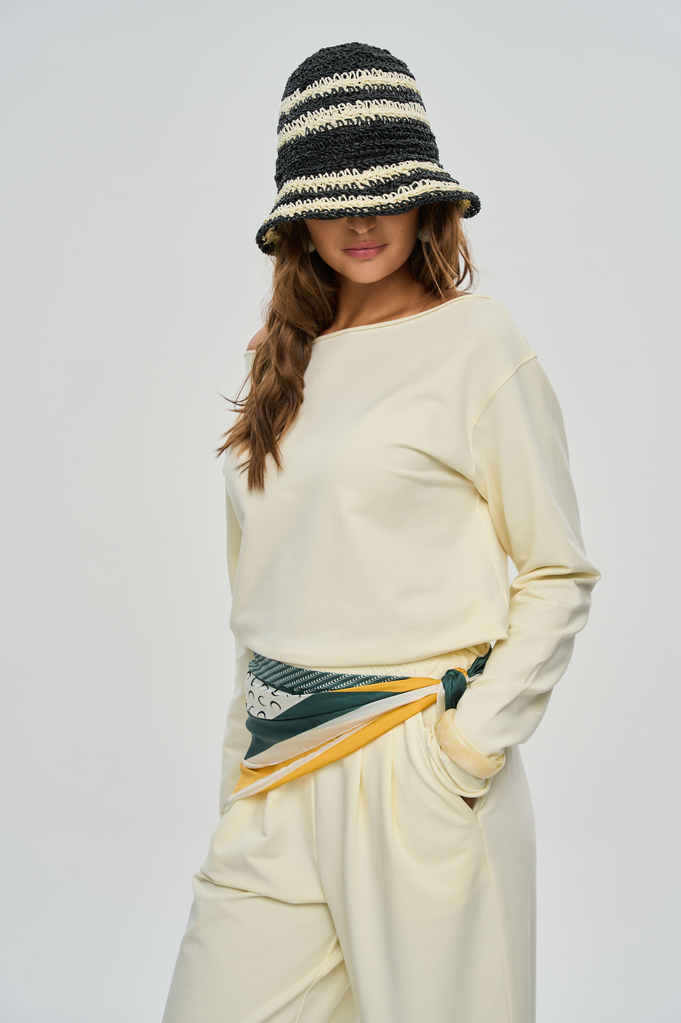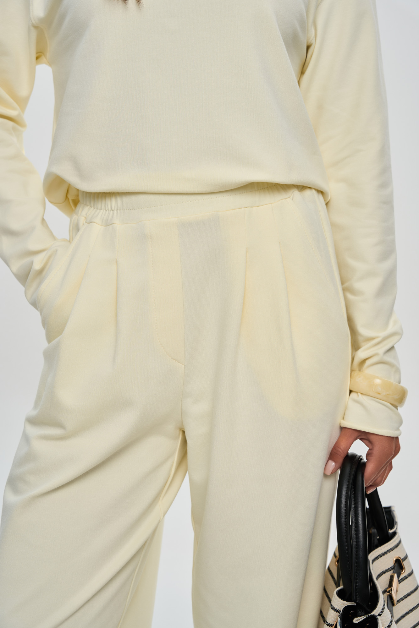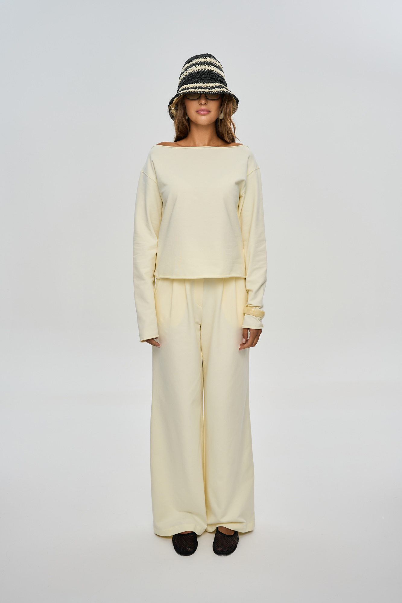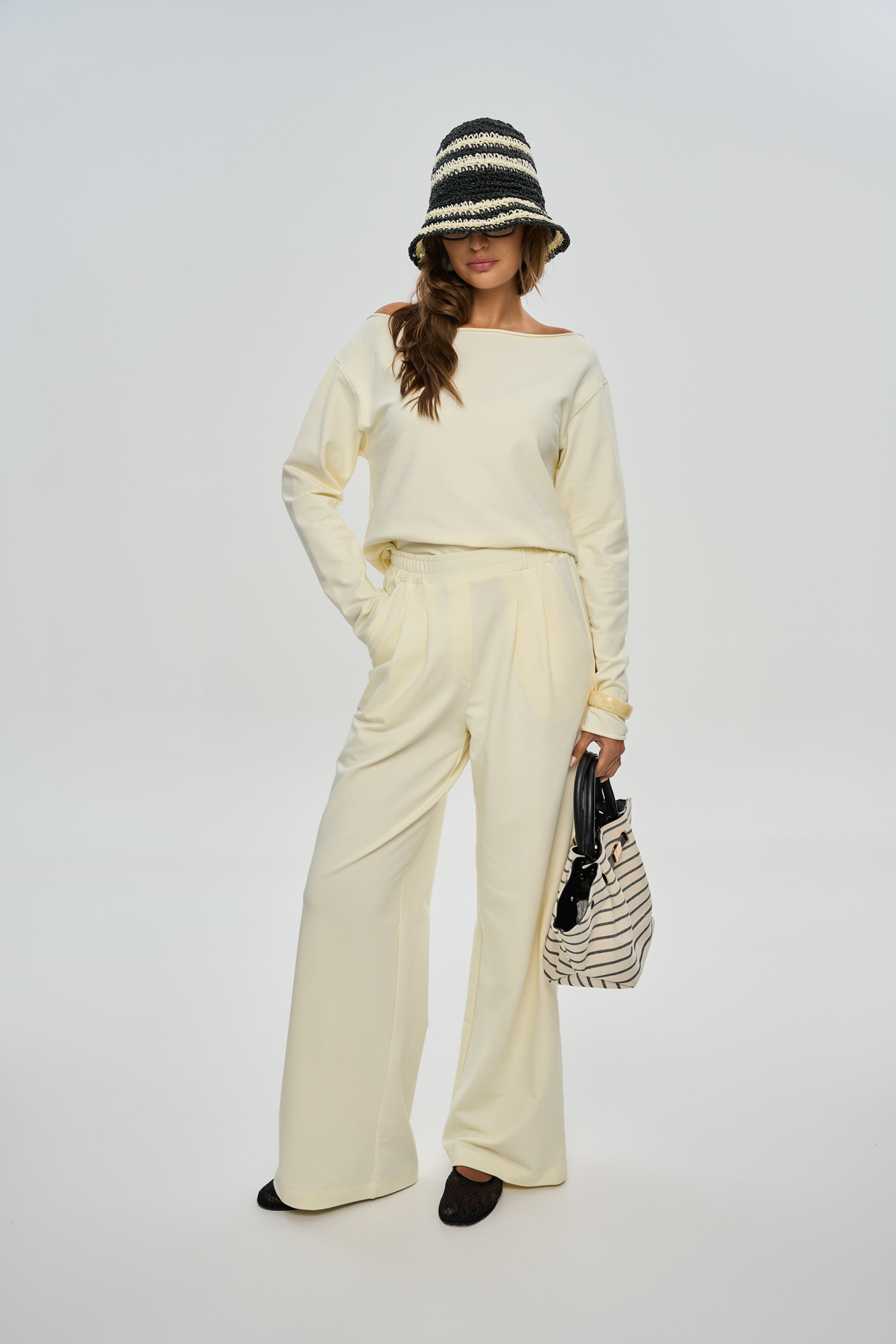 Состоит из свитшота со спущенной линией плеч и брюк-палаццо с защипами.