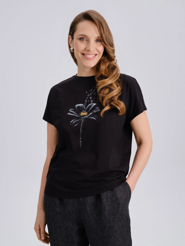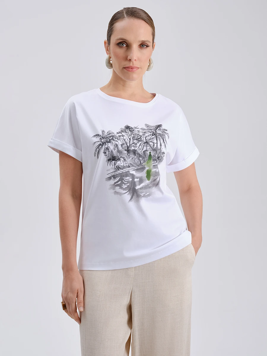 Женская футболка прямого кроя выполнена из мерсеризованного хлопка, что придает ткани мягкость, благородный блеск и долговечность. Белый цвет служит отличным фоном для выразительного принта в стиле пейзажа: графичное изображение деревьев и зелёный акцент создают эффект ручной росписи. Классический круглый вырез и короткие рукава с декоративным подворотом подчеркивают лаконичность модели и делают её универсальной в повседневных комплектах.