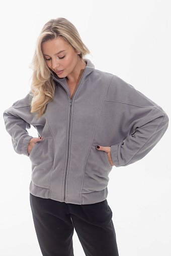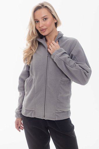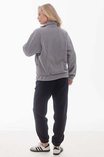 Толстовка на молнии выполнена из однотонного поларофлиса. Модель с воротником-стойкой и удобными карманами с притачной планкой. Полочка и спинка оформлены рельефами, на боковой части полочки выполнены два подреза. Спущенный рукав собран на резинку по низу, в поясе также вставлена резинка для комфортной посадки. Все декоративные линии аккуратно отстрочены, что придаёт изделию завершённый и стильный вид.