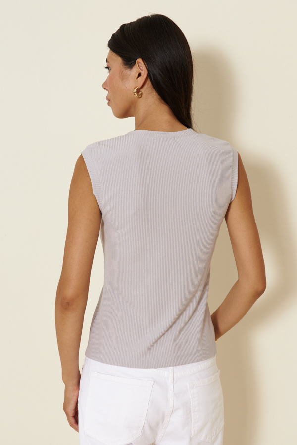 Джемпер прилегающего силуэта из эластичного полотна в рубчик. V-образный вырез горловины и линия проймы оформлены бейками.