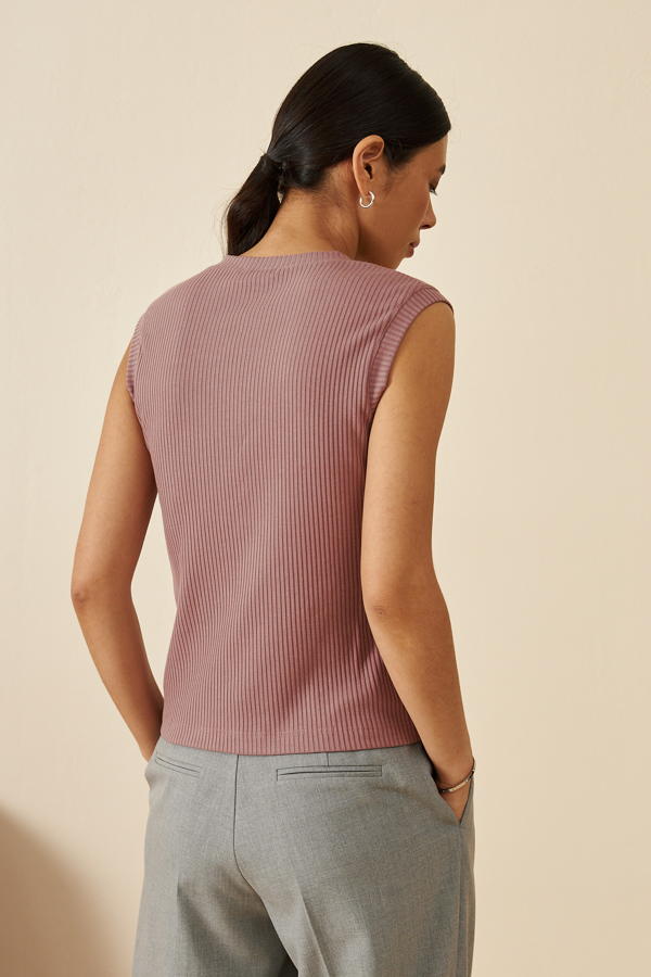 Джемпер прилегающего силуэта из эластичного полотна в рубчик. V-образный вырез горловины и линия проймы оформлены бейками.