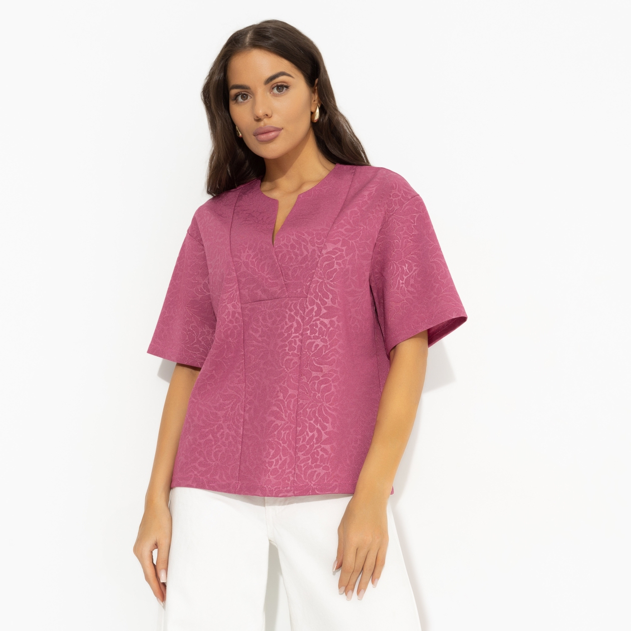 Блуза свободного кроя «Позиция лидера (pink)» от CHARUTTI — это истинное воплощение элегантности и универсальности. Эта женская блуза станет идеальным выбором для тех, кто хочет подчеркнуть свою индивидуальность и харизму. Изготовленная из текстурных тканей «Скуба» и «жаккард», она придаёт образу глубину и изысканность. Деликатный V-образный вырез и слегка спущенная линия рукава делают её идеальной для любого случая — будь то вечерняя прогулка с друзьями или важная встреча на работе. Если вы ищете блузку, которая станет основой гардероба, то эта модель — ваш идеальный выбор.
