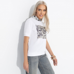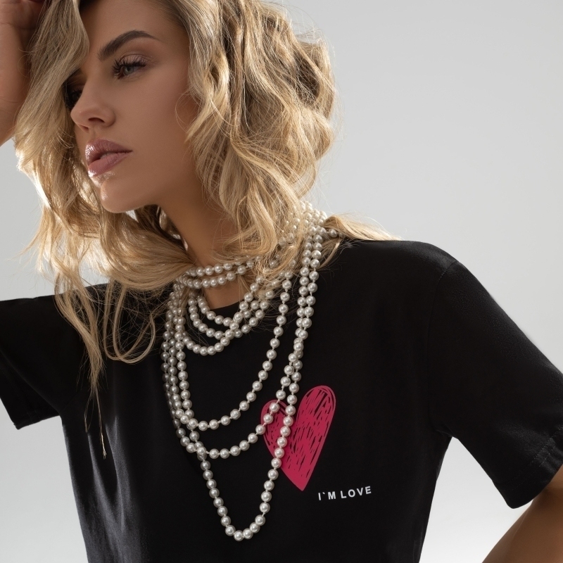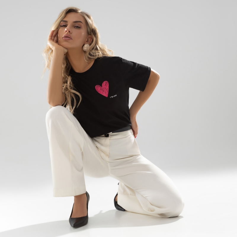 футболка соответствует размеру, отличное качество пошива, плотный трикотаж, при стирке принт(сердечко) не выцветает. Рекомндую!