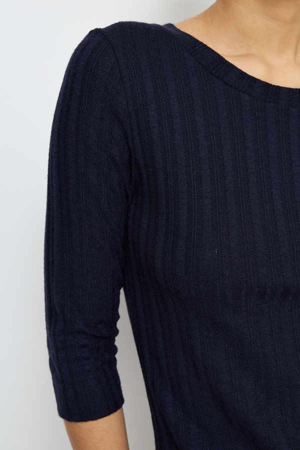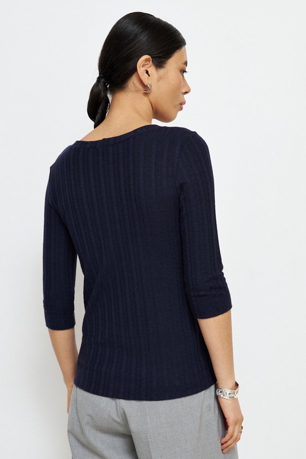 Джемпер прилегающего силуэта из фактурного эластичного полотна. Втачной рукав 3/4. Круглый вырез горловины оформлен бейкой.