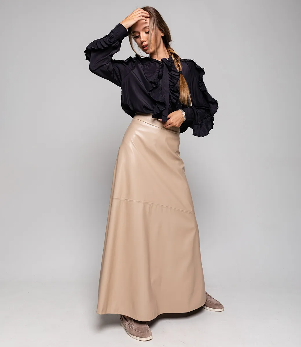 Юбка из эко-кожи длинны макси сделает образ ярким и при этом комфортным.