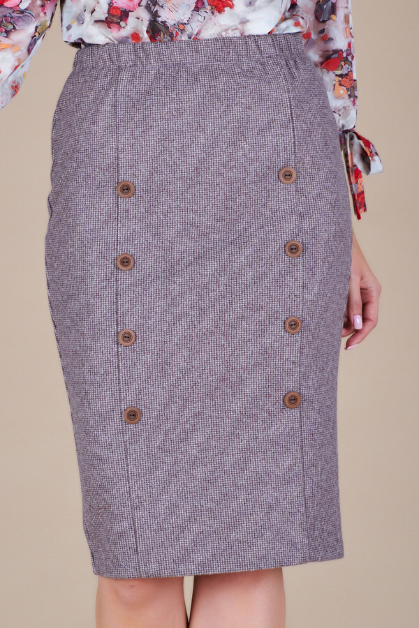 Юбка прямого силуэта, зауженная книзу, из мягкого костюмного трикотажного полотна с жаккардовым узором Пье-де-пуль. На передней части изделия рельефы, украшенные пуговицами. Сзади по среднему шву выполнен разрез. Эластичный пояс на резинке обеспечивает хорошую посадку по фигуре.