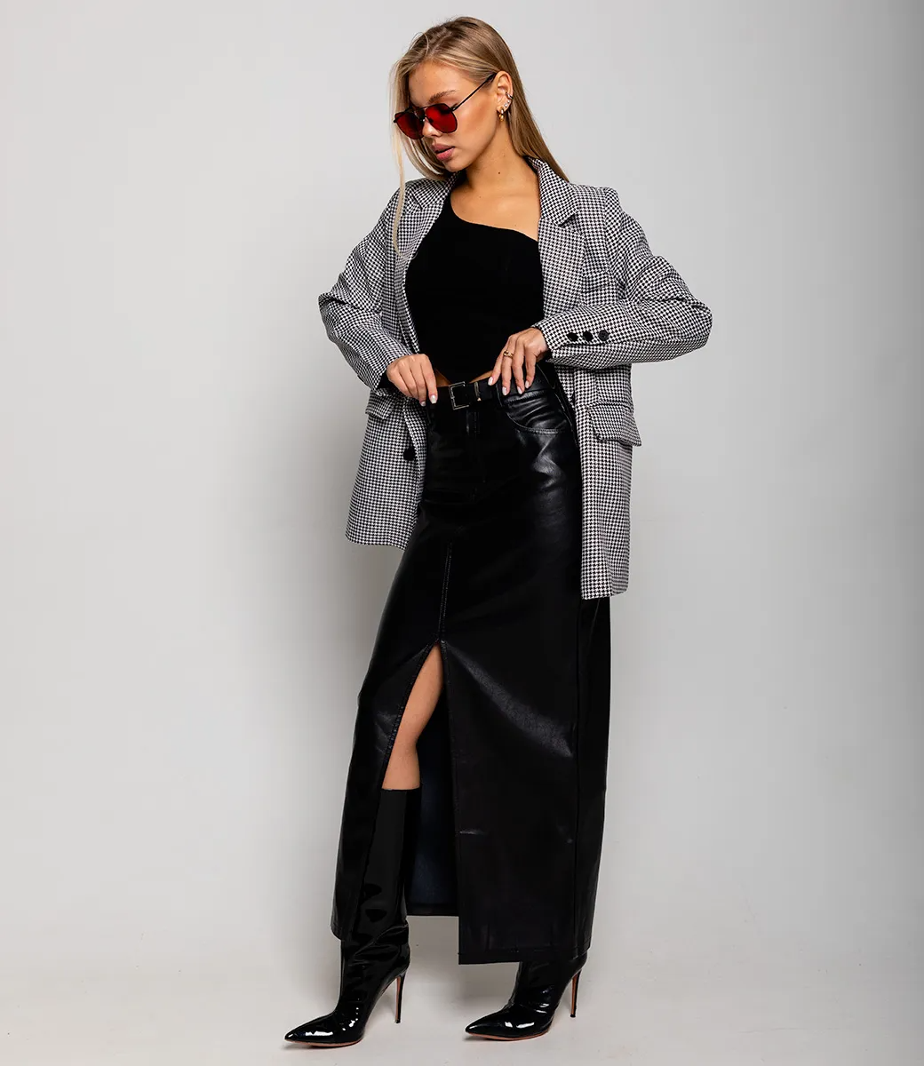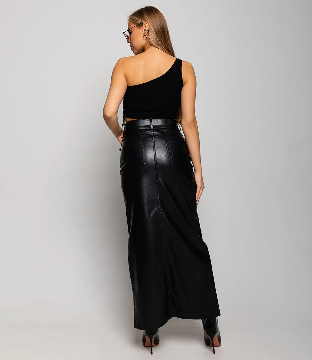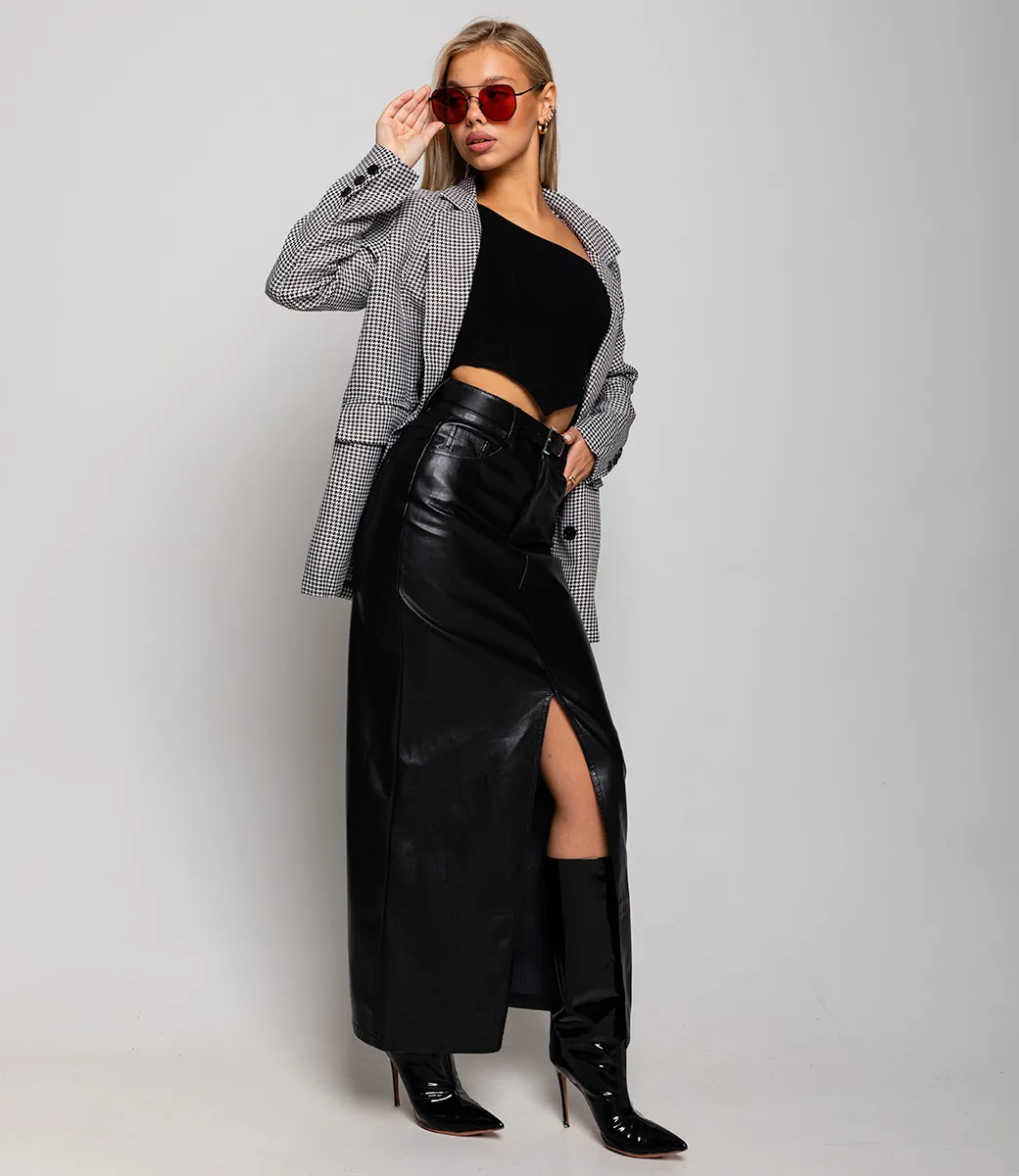 Кожаная длинная юбка с разрезом спереди - это смелое и гламурное дополнение к гардеробу современной женщины. Она обладает соблазнительной и роскошной внешностью, привлекая внимание своим провокационным стилем и уникальным дизайном.