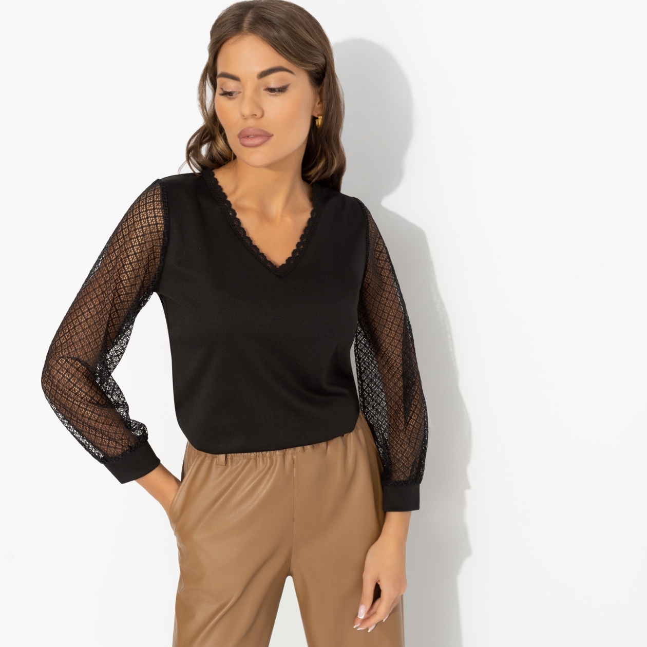 Сетчатая ткань, как вуаль тайных возможностей, обволакивала каждый её жест. Так отдавать распоряжения проще. В блузе ЧАРУТТИ она была не просто руководителем, а настоящей офисной феей, с которой лучше не спорить. Блуза из эластичной ткани. Рукава оформлены сеткой в тон изделия. Зона декольте обрамлена лаконичной линией кружева. Блуза хорошо смотрится в заправленном виде и навыпуск.