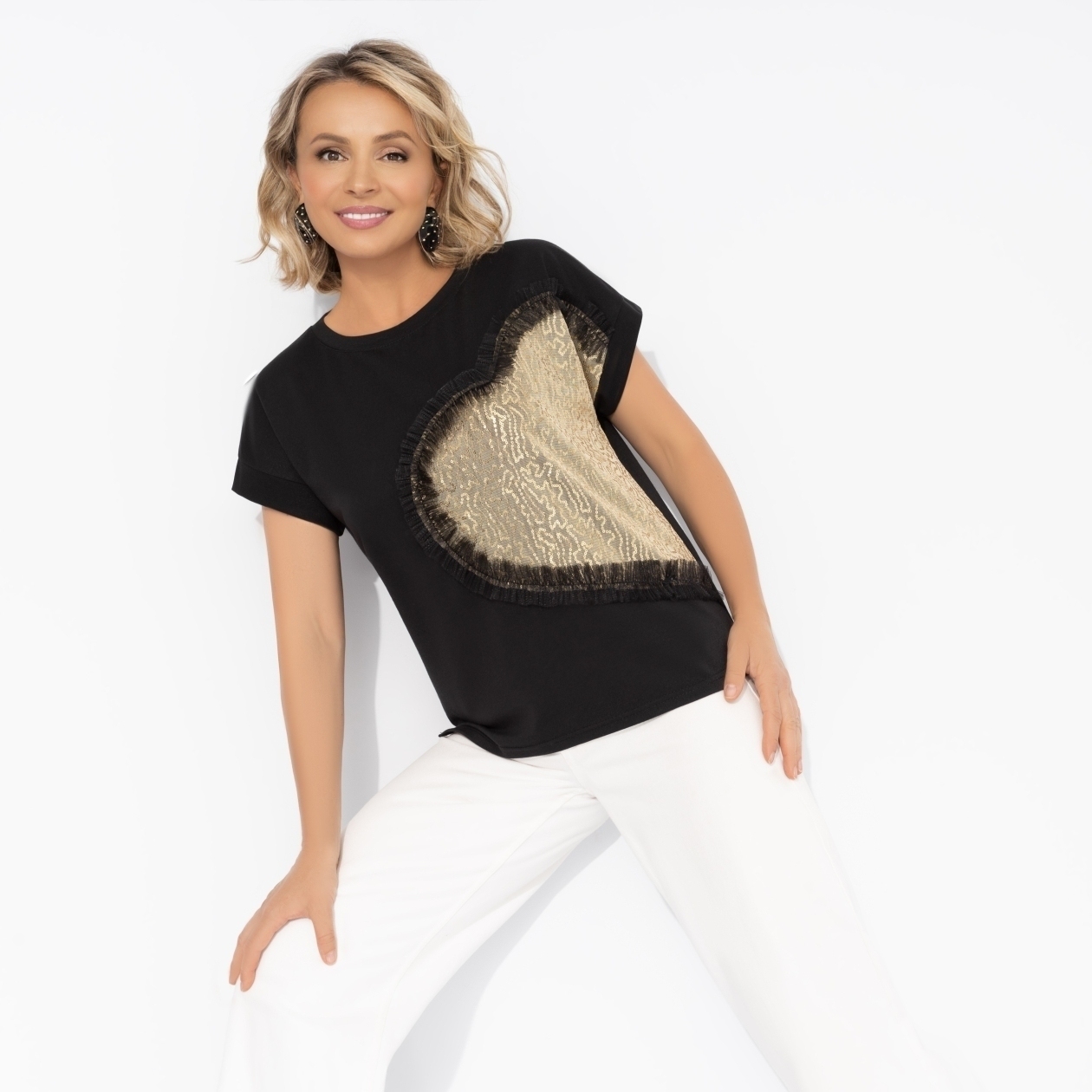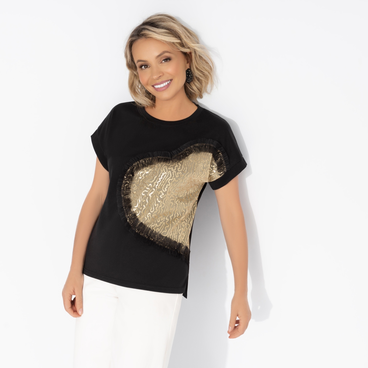 Модный must-have. Футболка ЧАРУТТИ – идеальное сочетание лаконичности и шика. Черная основа подчеркивает элегантность, а мерцающие золотые пайетки добавляют ноту праздника даже в повседневный образ. Футболка сочетается с кожаной юбкой для вечернего выхода или с рваными джинсами для дерзкого уличного стиля. Футболка свободного кроя. Изделие слегка удлиненное. На передней стороне декор из пайеток и сетчатой ткани. Паетки и сетка прошиты.