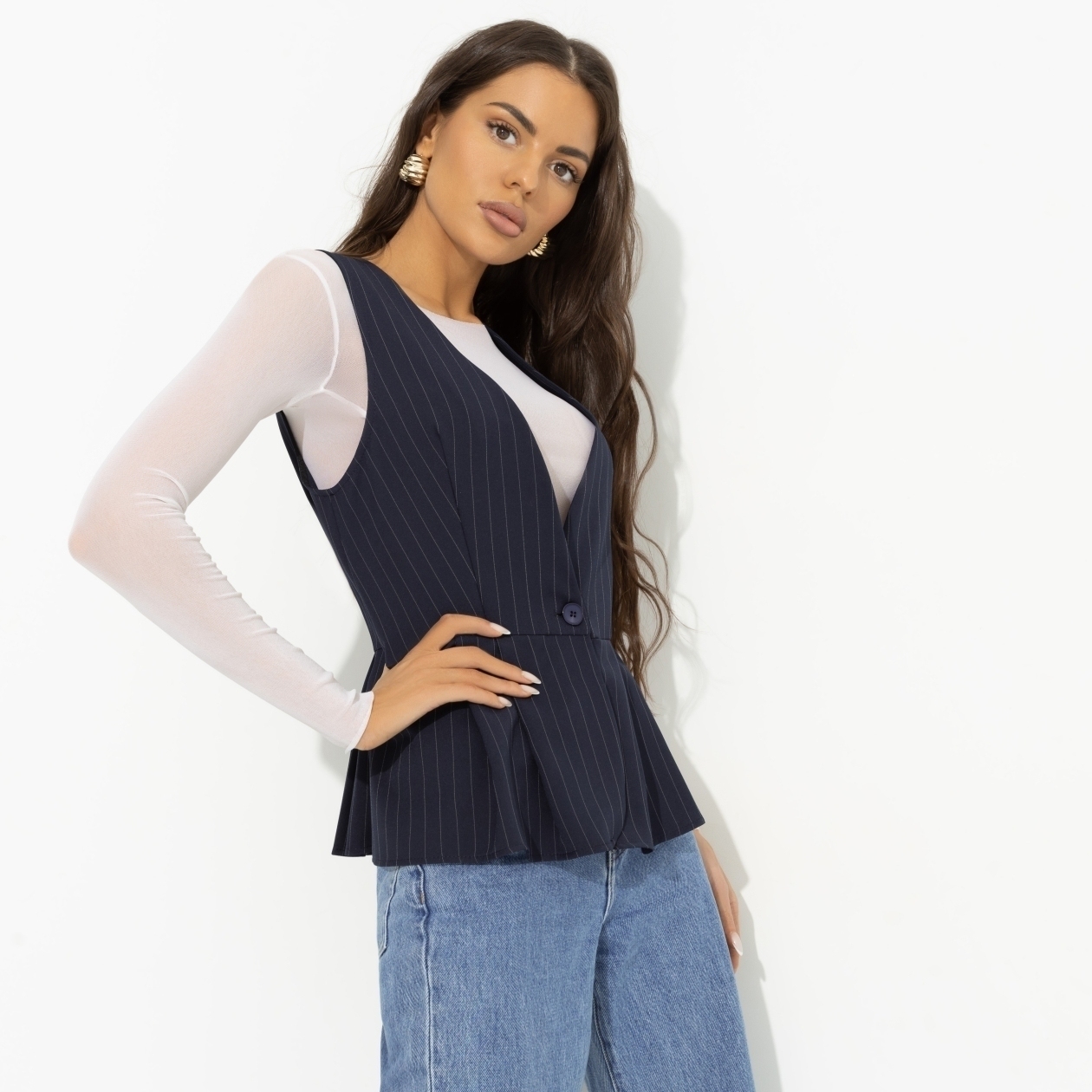 Этот жилет женский больших размеров подойдет дамам с любыми параметрами, подчеркивая достоинства фигуры благодаря приталенному силуэту и изысканной баске на подоле. Это изделие без лацканов, что придает ему современный и лаконичный вид, идеально подходящий для создания стильных образов. Уникальная застежка на одну пуговицу добавляет жилету шарма и делает его универсальным выбором как для деловых встреч, так и для вечерних выходов. Оптом приобретение этого жилета позволит вам предложить своим клиентам роскошь по доступной цене, создавая уникальные предложения в вашем магазине.