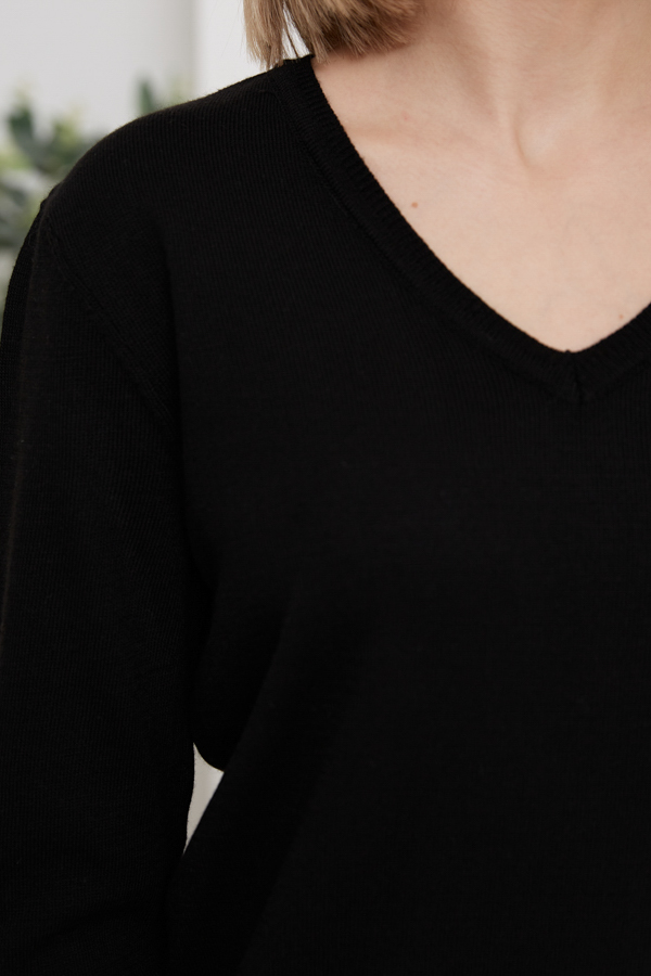 Джемпер полуприлегающего силуэта с длинным втачным рукавом. Низ изделия, низ рукава и V-образный вырез горловины оформлены резинкой. Изделие выполнено из мягкой структурированной пряжи.