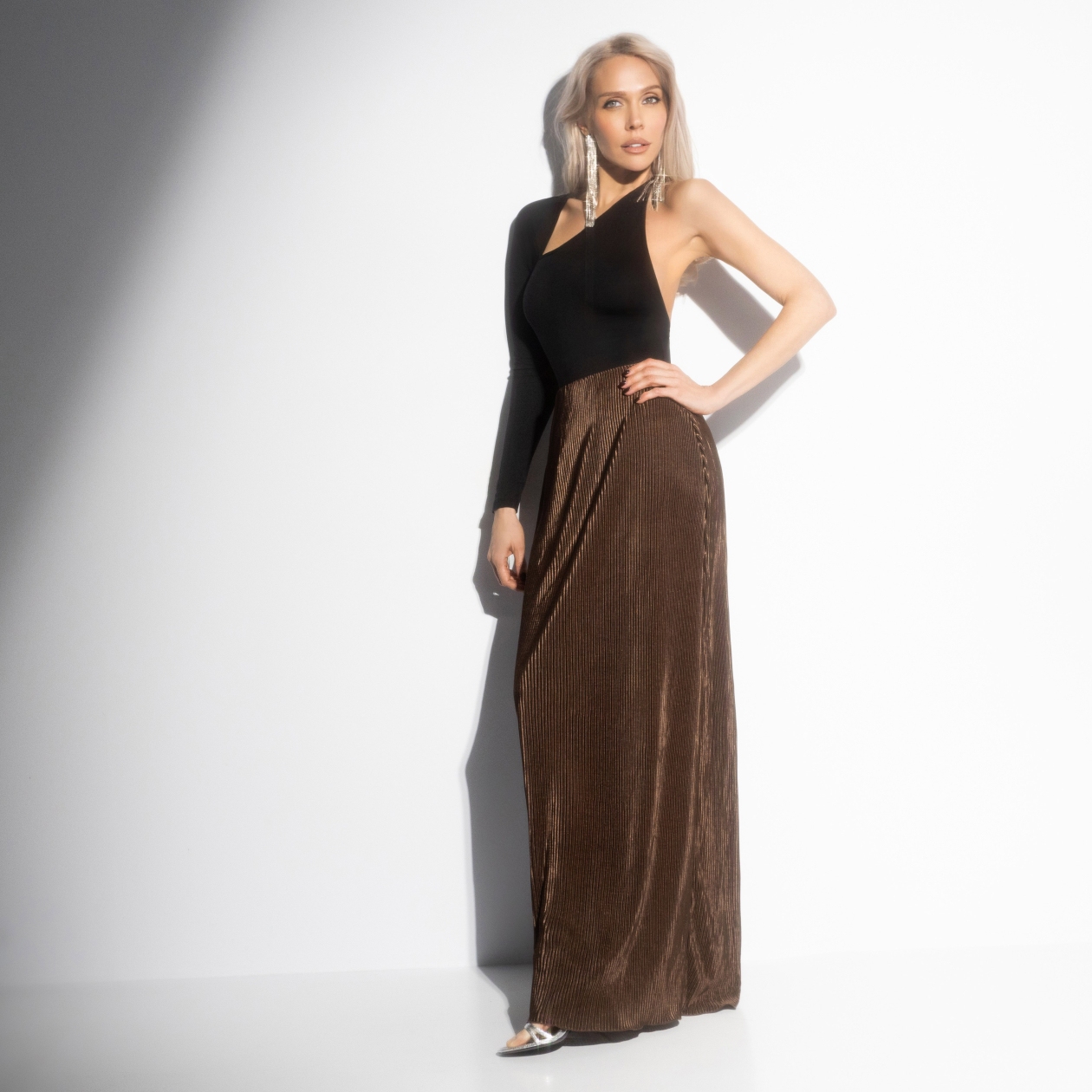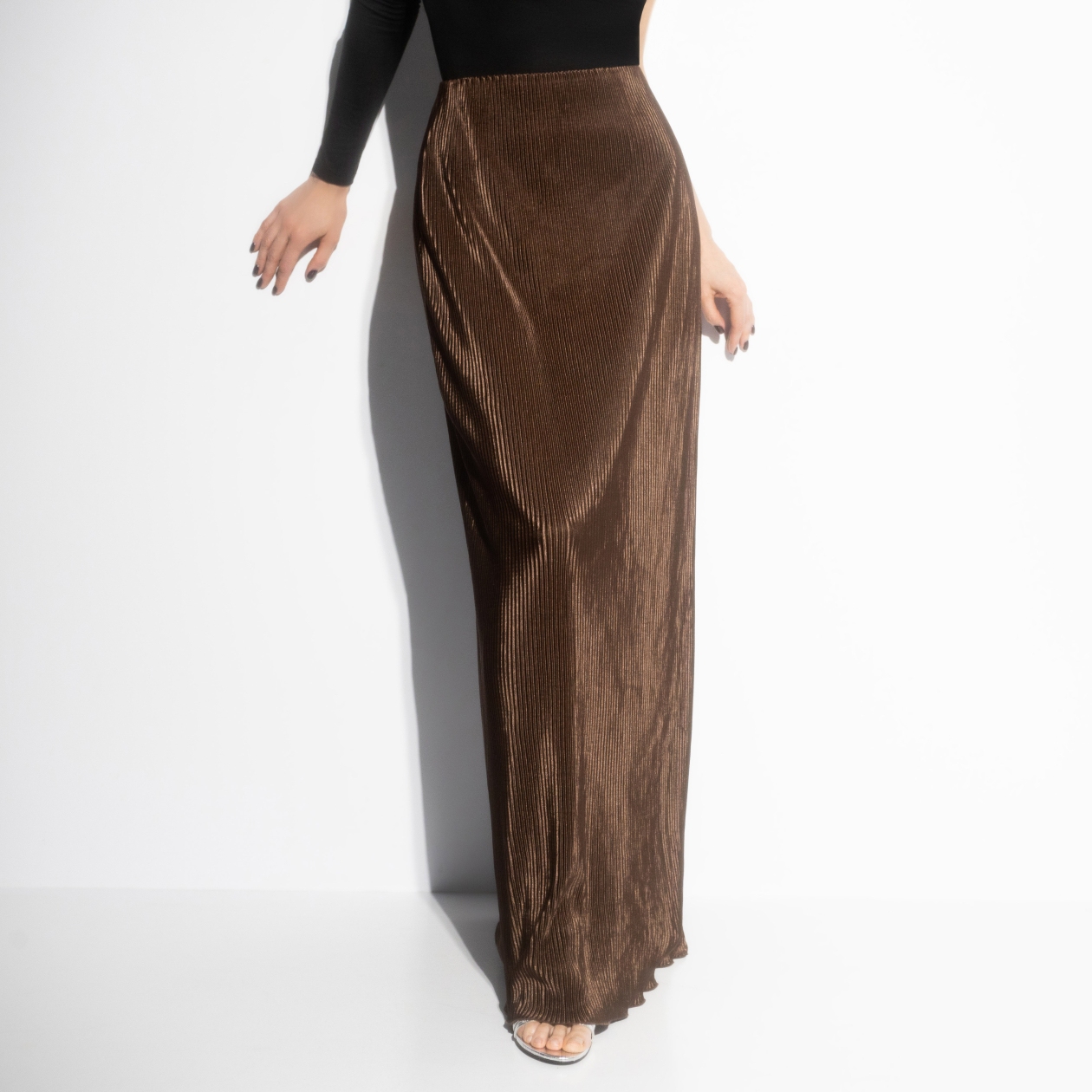 Думаешь, богиня красоты ‒ это Афродита? Как бы не так… Это ведь ты! Юбка, которая очаровывает и помогает тебе стать финальным боссом женственности, ‒ в бронзовом оттенке, из струящегося трикотажа гофре. Идеалная плавность движений, абсолютная гармоничность с любыми твоими идеями. То, что надо! Юбка в длине макси, пояс на скрытой резинке, без застёжек.