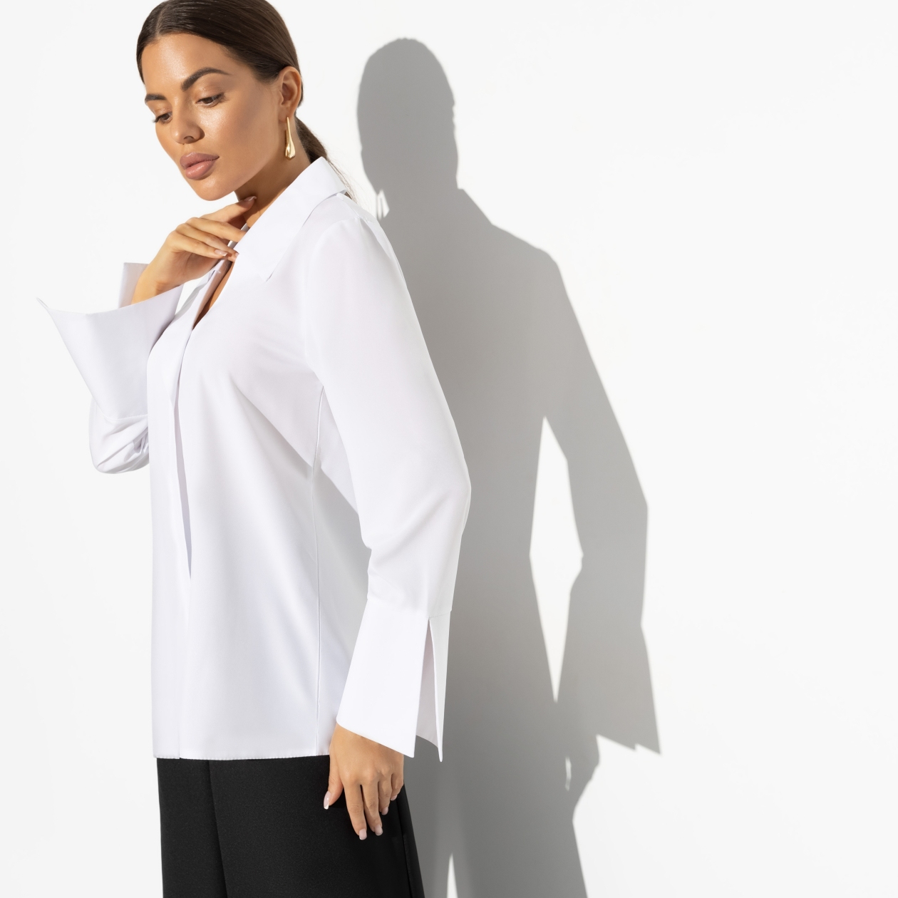 Как говорили старожилы Уолл-стрит, босс не тот, кто пришел на работу в белой рубашке, а тот, у кого она осталась белой после бизнес-ланча. Амбассадоры CHARUTTI отличаются аккуратностью, правда же?! Рубашка в классическом стиле. Имитация линии пуговиц. Слегка расклешенный манжет с разрезами. Свободный крой, хорошо смотрится на любом типе фигуры.