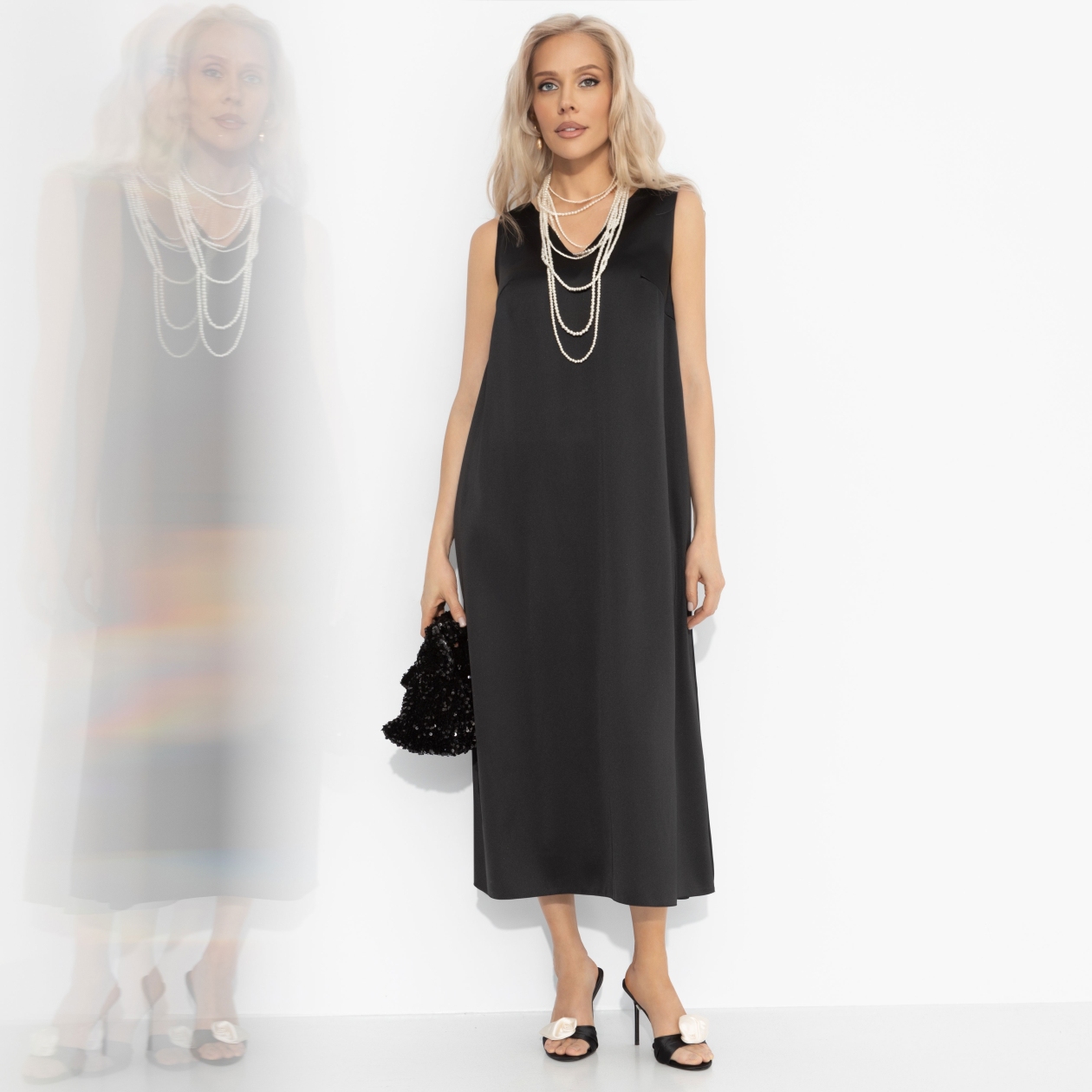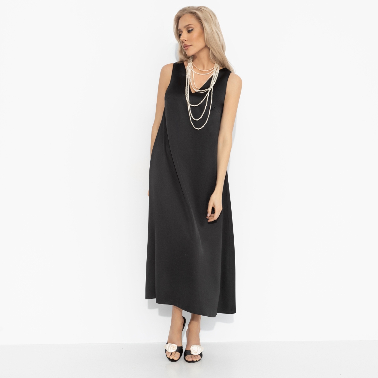 Минимализм, доведённый до совершенства. Это платье создаёт ощущение внутреннего покоя и уверенности – как будто вы уже на шаг впереди. Комфорт и элегантность здесь не спорят, а дополняют друг друга. Платье выполнено из струящегося атласа с лёгким блеском. Свободный силуэт и лаконичные детали позволяют сочетать модель с аксессуарами любого стиля. Комбинируйте с жакетами и кардиганами.