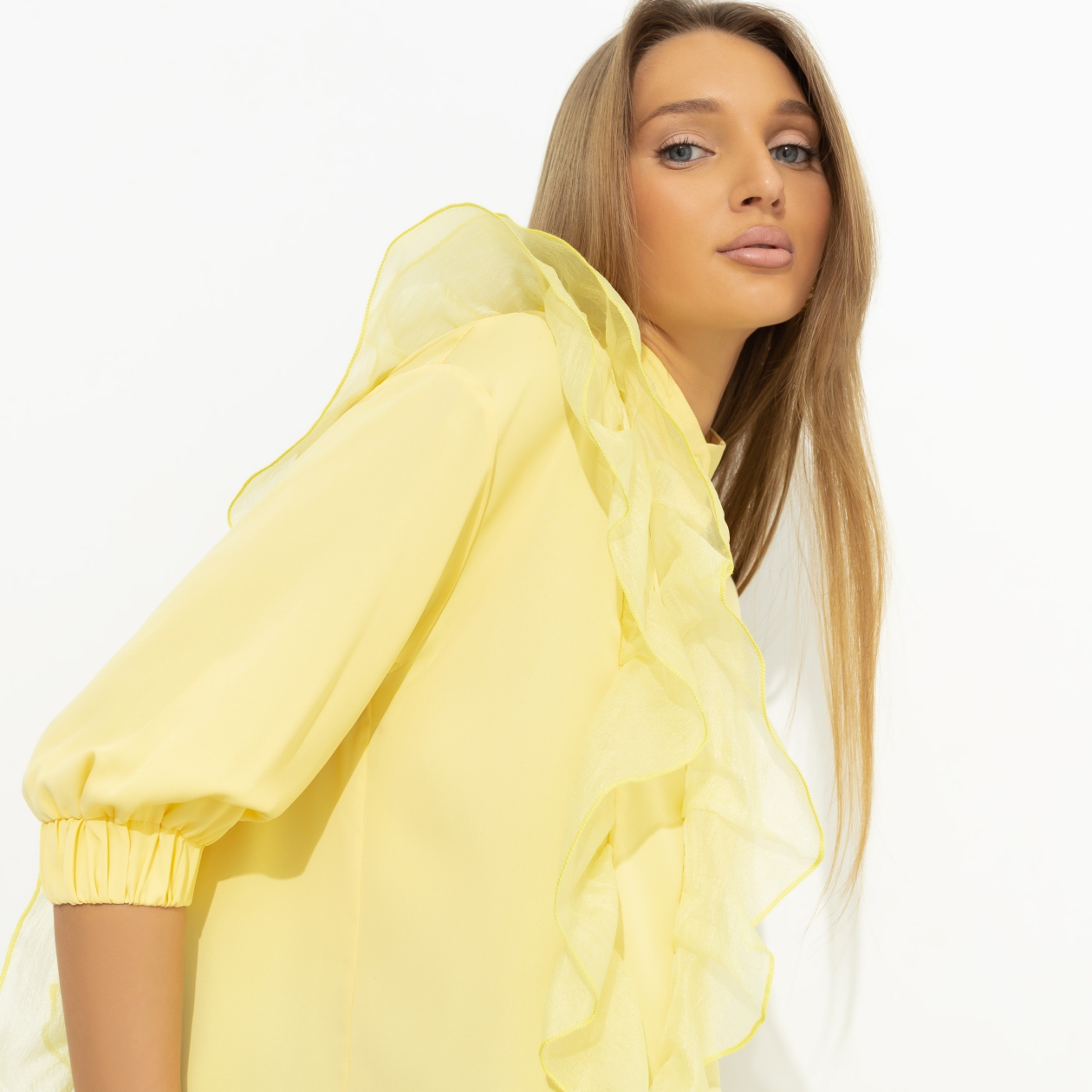 Пусть ваша жизнь будет наполнена солнечным светом, даже если на улице пасмурно. За хорошее настроение отвечает ваш настрой и ваш образ. В рубашке CHARUTTI в сочном оттенке все хорошо будет не только у вас, но и у всех, кого вы встретите. Рубашка прямого силуэта. Рука укорочен, оформлен скрытой резинкой. Асимметричный декор в виде объемных рюш по передней и задней стороне изделия. Имитация кармана с одной стороны изделия.