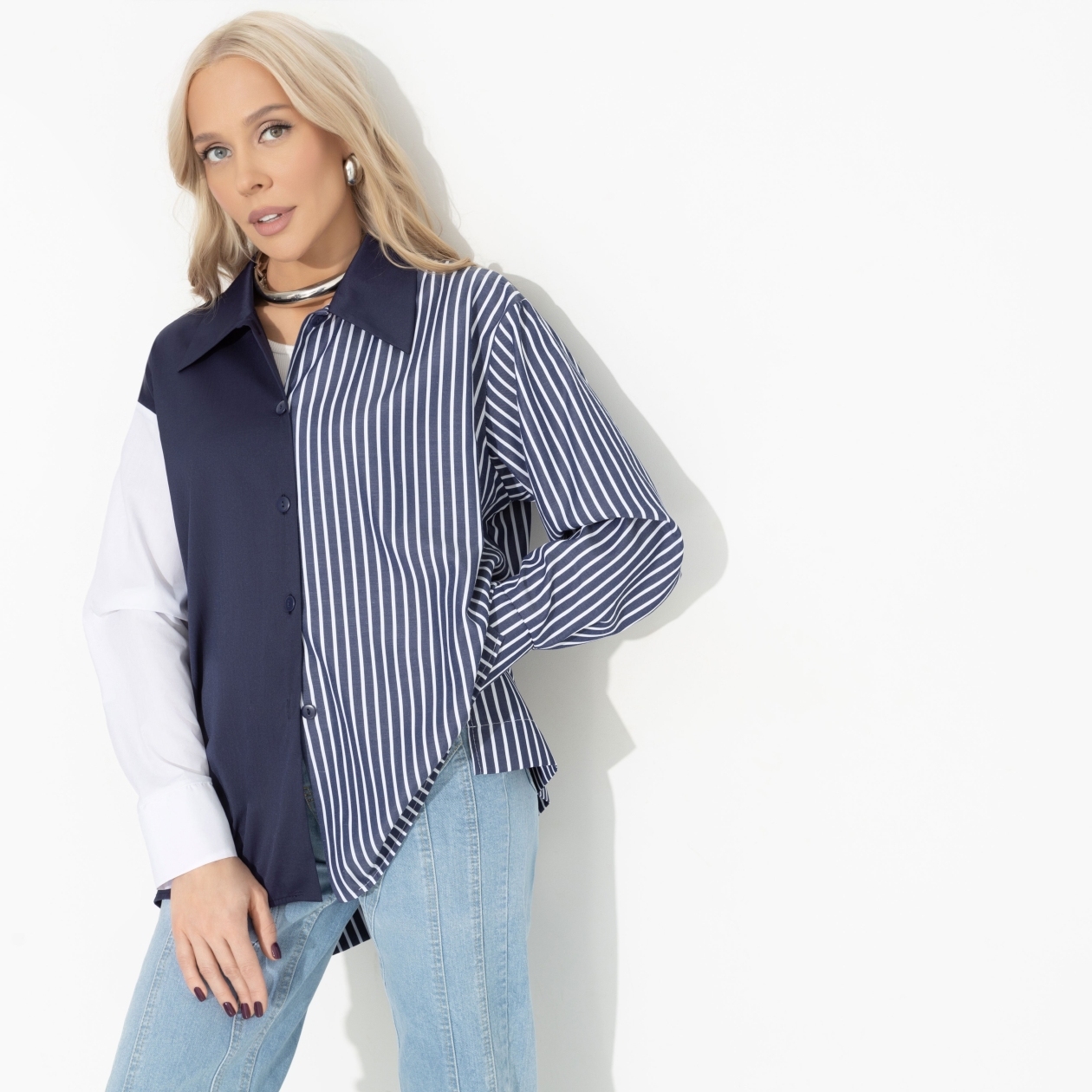 Если вы ищете рубашки женские, которые подчеркнут вашу индивидуальность и при этом сохранят комфорт, то рубашка комбинированная «Навсегда в сердце (blue)» станет идеальным выбором. Оптом приобретение таких рубашек позволит наполнить гардероб множеством вариаций для разных случаев. Будь то джинсовая рубашка женская или рубашка белая женская – эта модель легко сочетает в себе простоту и изящество, позволяя вам оставаться неповторимой. Пуговицы по передней части изделия добавляют классическую нотку, делая рубашку универсальной и легкой в носке.