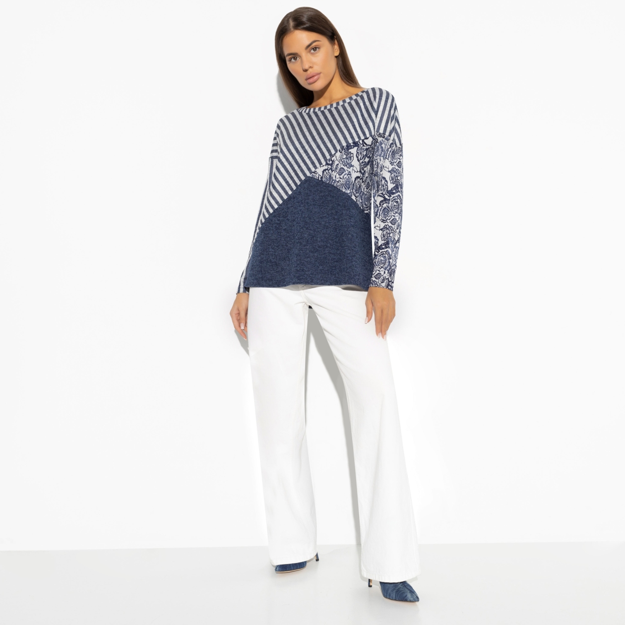 Голубая матча на кокосовом молоке и голубичный макарон. Твой экстравагантный способ прийти в ресурсное состояние. Ты можешь себе позволить выбирать небанальное. Например, тунику CHARUTTI с геометричным принтом. Туника свободного кроя из комбинации разных видов ткани. Спущенная линия плеча. Спинка изделия чуть удлинена.