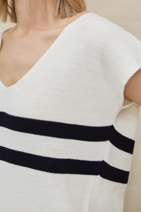 Джемпер свободного силуэта с фактурой «жемчужный узор». Спущенная линия плеча. Низ изделия, линия проймы и V-образный вырез горловины оформлены двойной нитью для усиления, что препятствует деформации в процессе носки. Изделие выполнено из мягкой структуриванной пряжи.