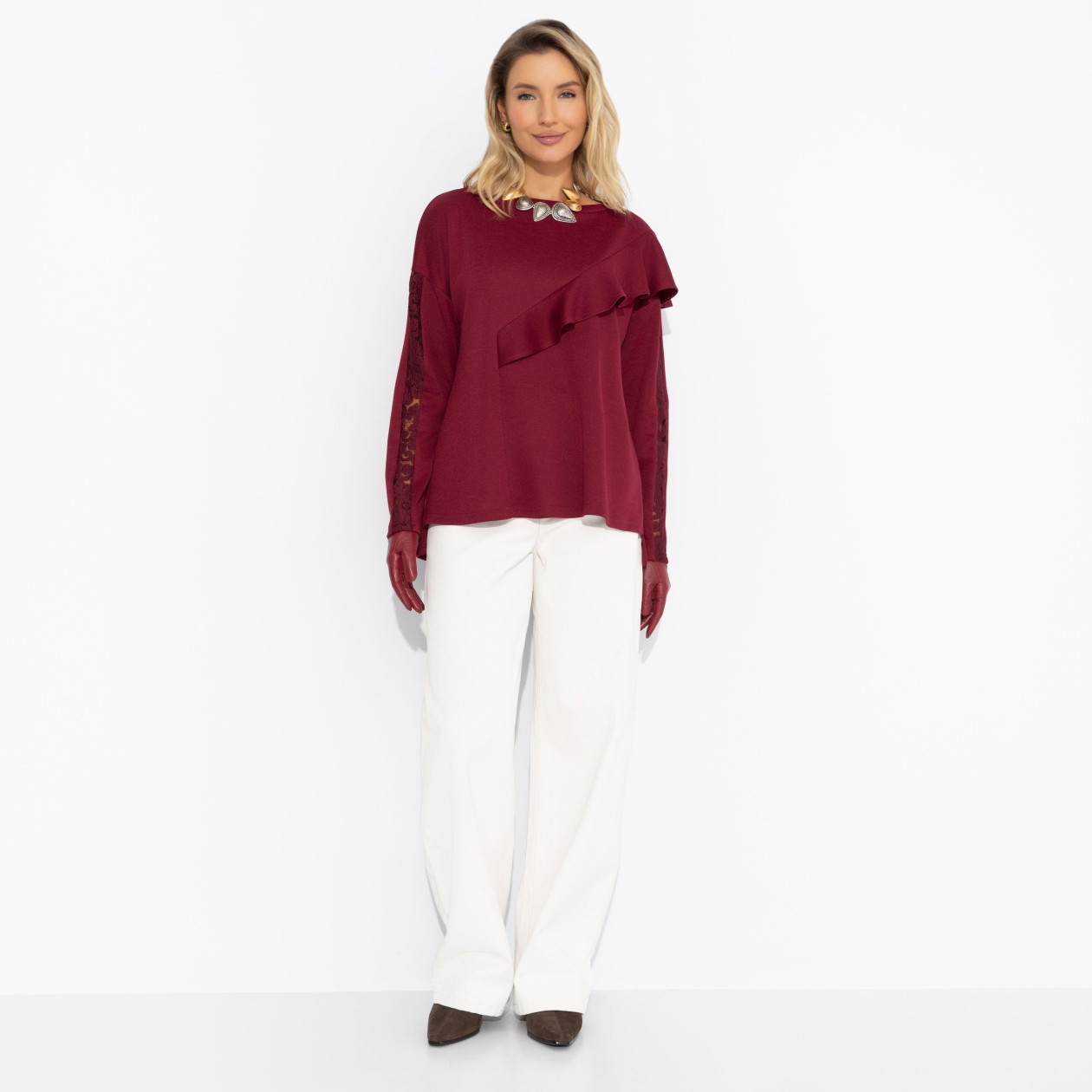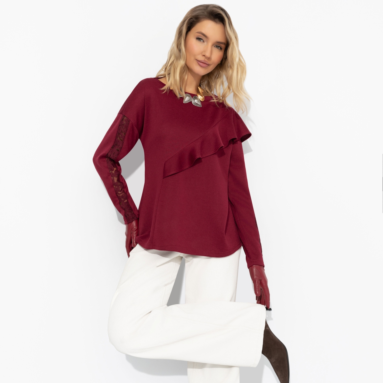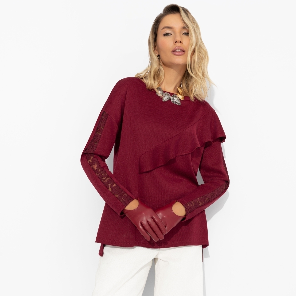 Ваш талисман на прохладное время года от ЧАРУТТИ. Глубокий винный цвет, акцентный крой изделия и шлейф женственности, обычно не свойственный столь комфортным изделиям. Туника ЧАРУТТИ создана для теплых объятий. Туника прямого силуэта. Объемный декор в виде рюш по центральной части изделия. Тонкая вставка кружева в тон изделия по рукавам. Ошибка при загрузке данных! (https://charutti.ru/upload/video-site/00000012159_video_site.mp4)