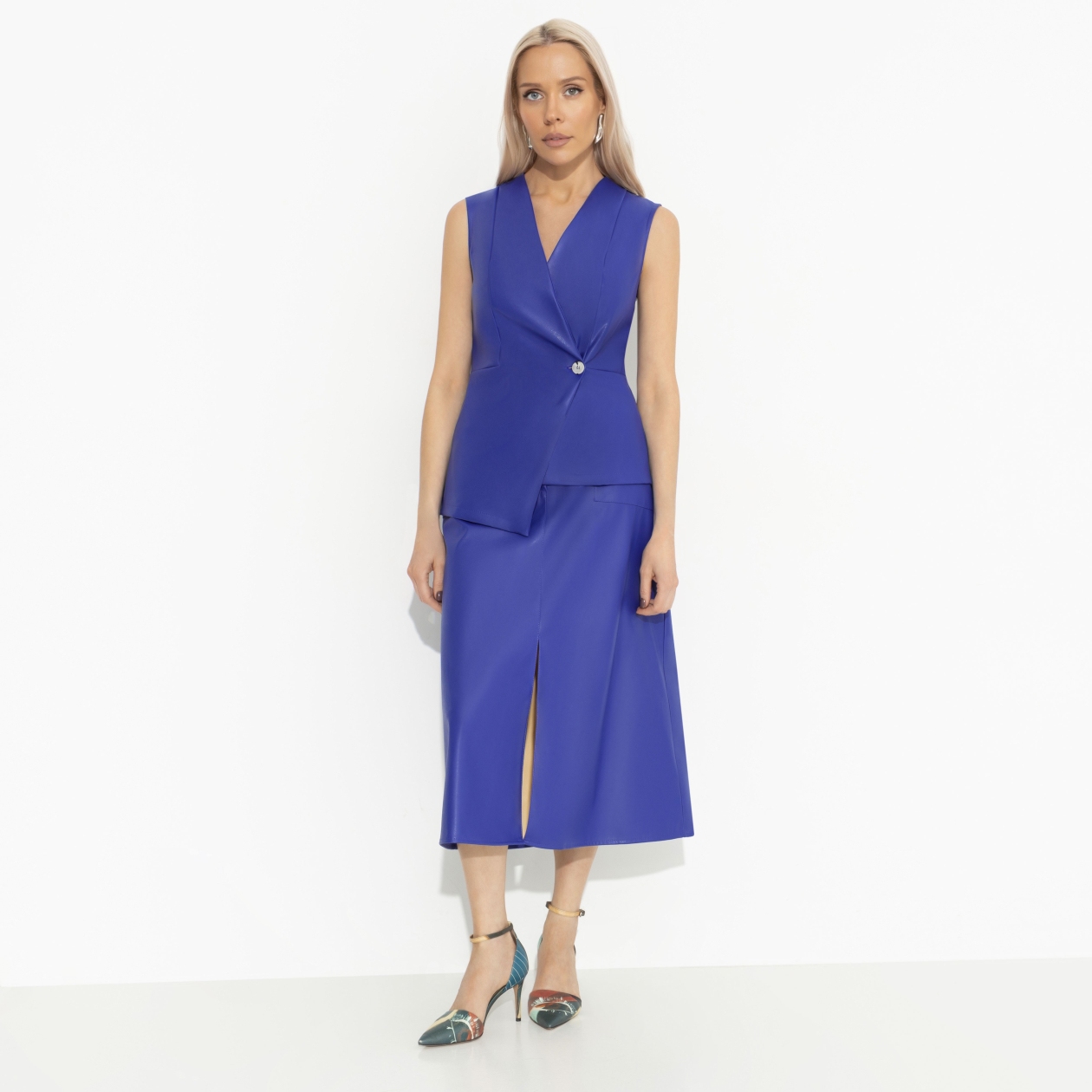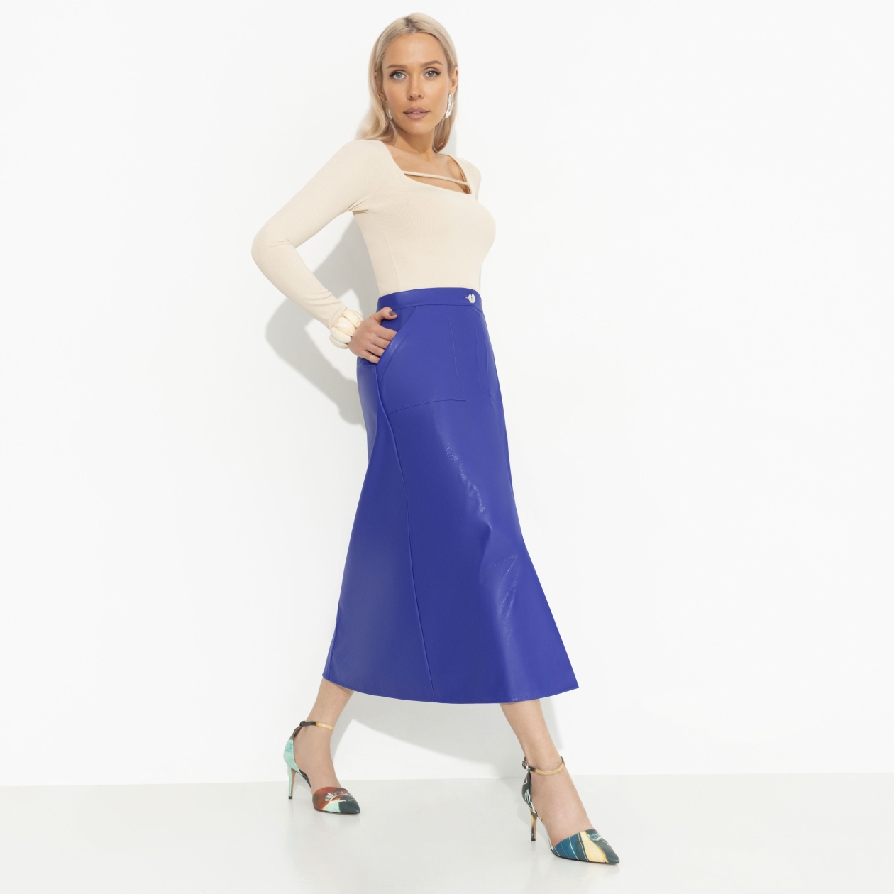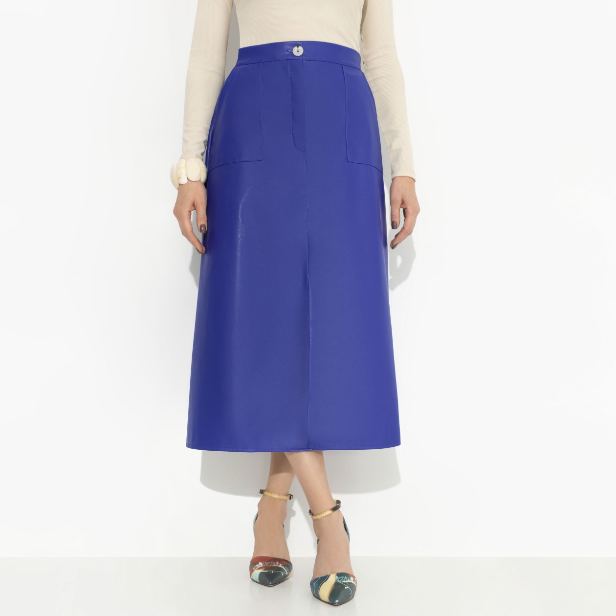Сколько бы ни было в вашем шкафу вещей CHARUTTI, всем им нужно потесниться, потому что юбка из экокожи в цвете «светящийся синий» ждать не может. Так и просится на бедра, ничего не поделать. Юбка в длине миди А-силуэта. Посадка на талии. Юбка застегивается на молнию и пуговицу. Изделие с карманами. Есть деликатный разрез по центральной части.