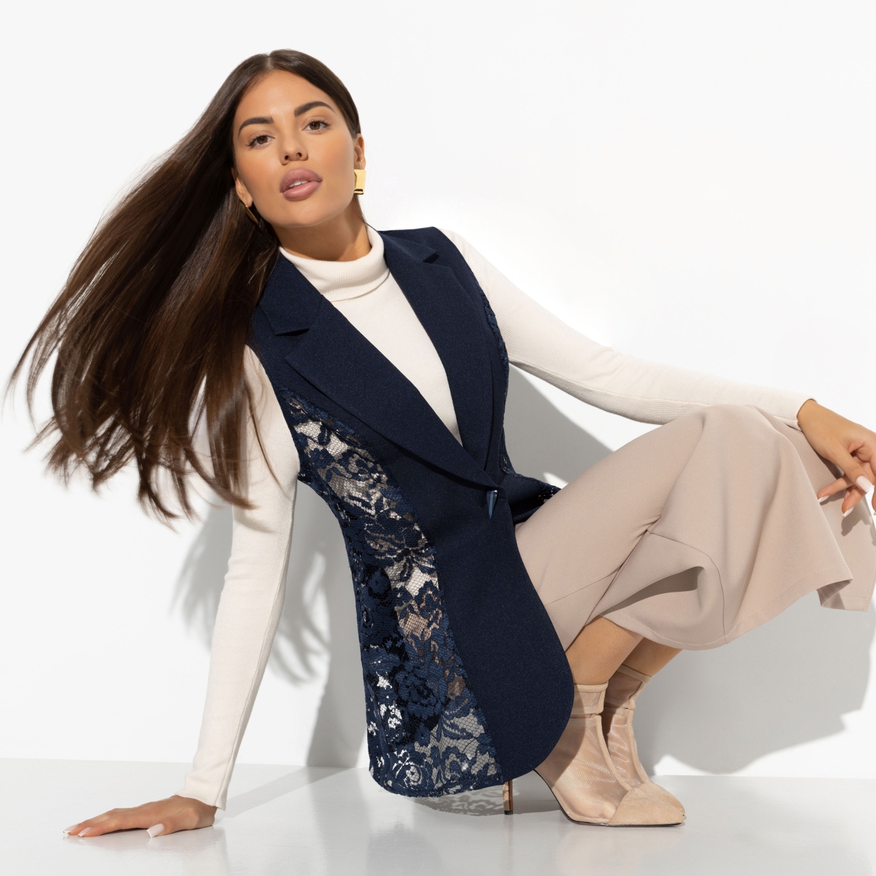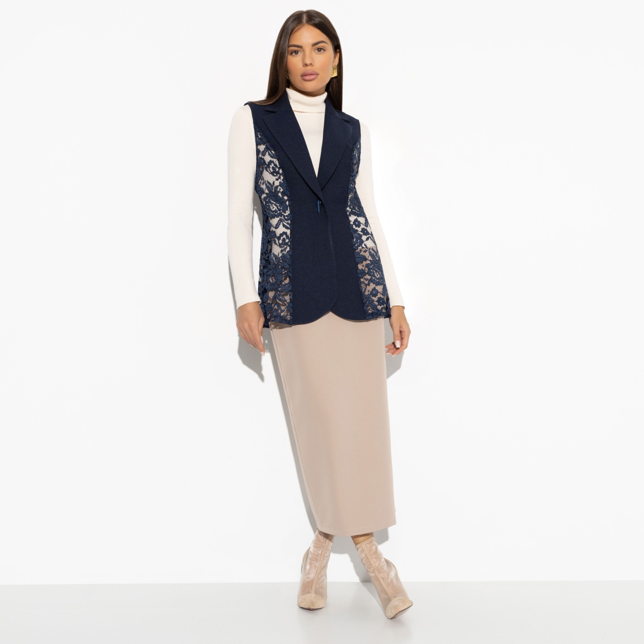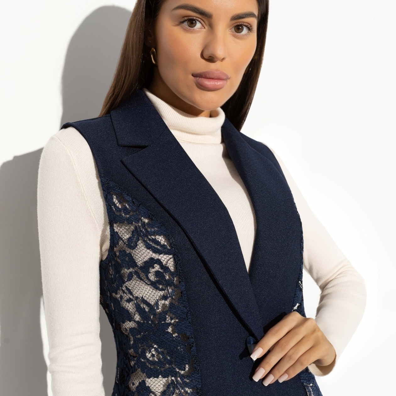 Проведенный среди мужчин опрос показал, что из всех видов ткани, кружево считается максимально привлекательным материалом. Не то, чтобы мы этого не знали, но выводы сделаем. Будем носить кружево на работу в виде жилета ЧАРУТТИ. Жилет приталенного силуэта с лацканами глубокого синего цвета. Застегивается на акцентную пуговицу. Длина изделия чуть ниже линии бедра.