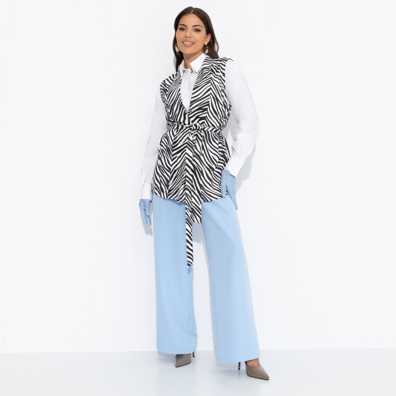Мелания Трамп часто выбирает черно-белый принт. Первая леди появляется в нем на встречах со своим мужем-президентом. Можем предположить, что «зебра» приносит удачу в серьезных вопросах. Подумайте об этом и выбирайте жилет ЧАРУТТИ для важных встреч. Жилет удлиненный. Прямой крой изделия. В комплекте есть длинный пояс в тон основного материала. Изделие без подклада.