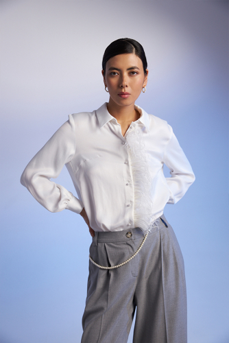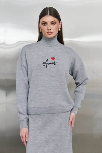 Джемпер свободного силуэта с вышивкой в области груди. Рукав втачной в спущенную пройму. Низ изделия и низ рукава оформлены резинкой, воротник-стойка с отворотом. Изделие выполнено из меланжевой пряжи.