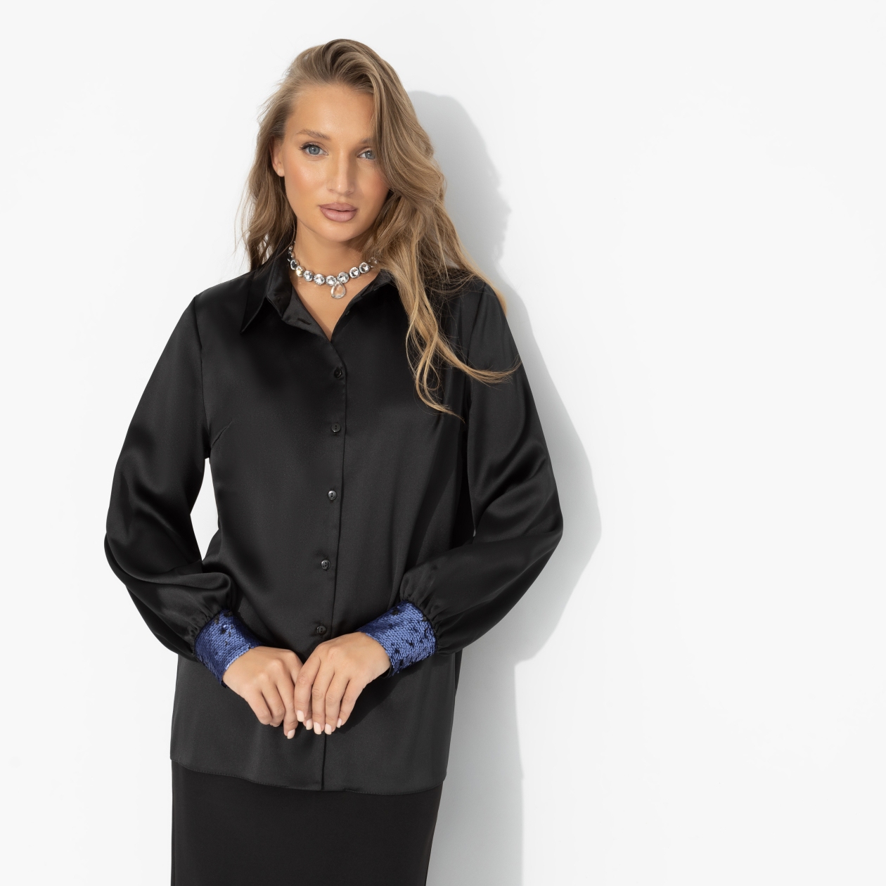 Твой образ – воплощение тихой, уверенной сексуальности. Здесь нет демонстративности – только гладкий блеск чёрного шёлка, скользящий по коже, и ощущение власти над вниманием. Всем понятно без слов: соблазн – это не игра, а состояние души. Ткань прекрасно держит форму и драпируется. Универсальный крой позволяет строить на основе этой модели как вечерние, так и деловые образы. Манжеты оформлены контрастными пайетками.