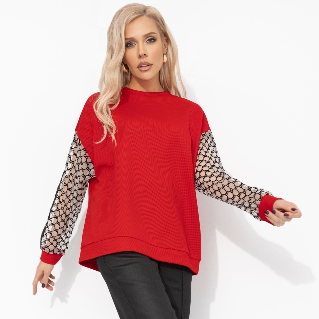 Свитшот ЧАРУТТИ насыщенного красного цвета – тот самый идеальный подарок, о котором ты сама мечтаешь. Его силуэт дарит ощущение безусловного уюта, в котором можно спрятаться от всего мира. Яркий, жизнеутверждающий оттенок поднимает настроение даже в самый хмурый день, заряжая энергией и уверенностью. В нём сочетается непринуждённая расслабленность и яркий акцент, делающий даже простой образ стильным и запоминающимся. Свитшот свободного кроя. Изделие удлиненное. Рукава декорированы акцентной тканью с текстурным узором и лампасами. Ошибка при загрузке данных! (https://charutti.ru/upload/video-site/00000012218_video_site.mp4)