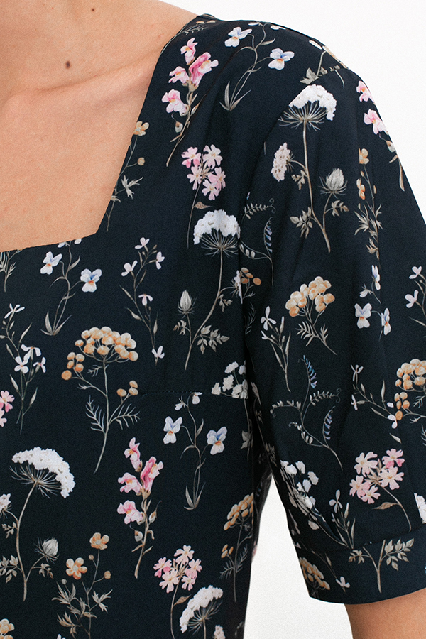 Блуза свободного силуэта из легкой блузочно-плательной ткани. Лиф с красивым вырезом каре, продублирован вторым слоем. Рукав втачной короткий с защипами по низу рукава и манжетой.