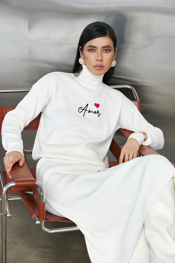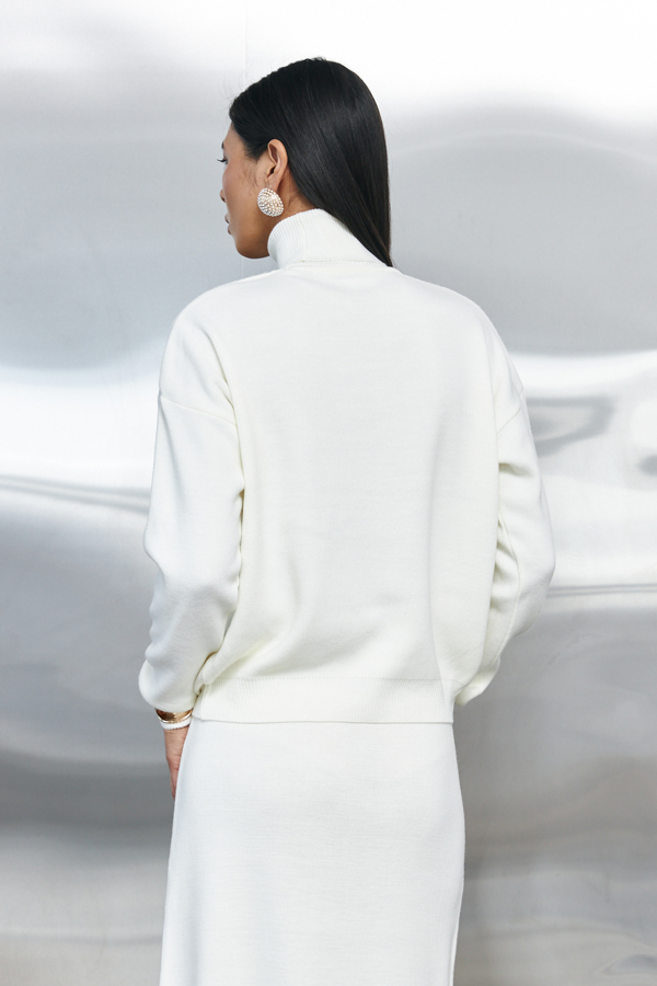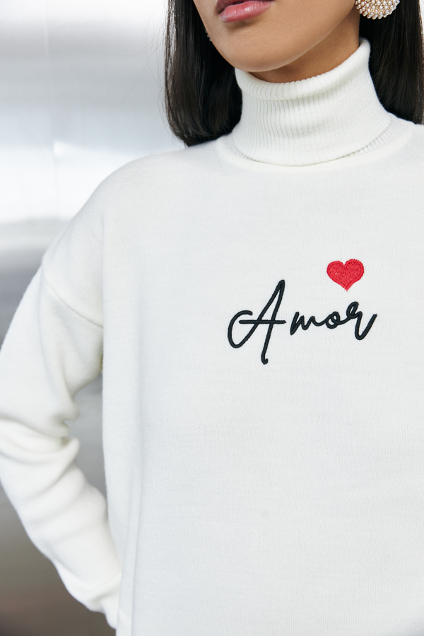 Джемпер свободного силуэта с вышивкой в области груди. Рукав втачной в спущенную пройму. Низ изделия и низ рукава оформлены резинкой, воротник-стойка с отворотом. Изделие выполнено из мягкой структурированной пряжи.