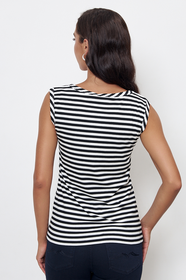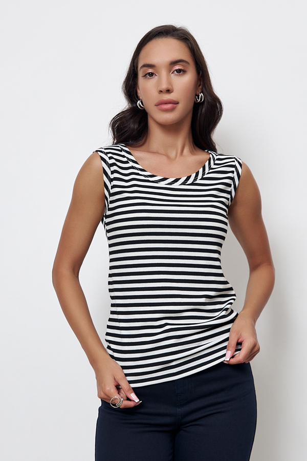 Топ из эластичного полотна полуприлегающего силуэта. Линия горловины и линия проймы окантованы эластичной бейкой.