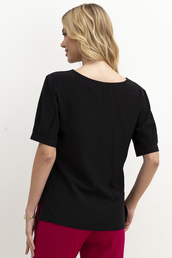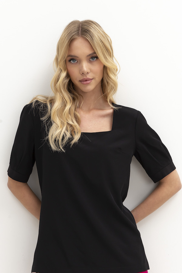 Блуза свободного силуэта из легкой блузочно-плательной ткани. Лиф с красивым вырезом каре, продублирован вторым слоем. Рукав втачной короткий с защипами по низу рукава и манжетой. В таблице размеров представлены параметры человека, а не изделия.