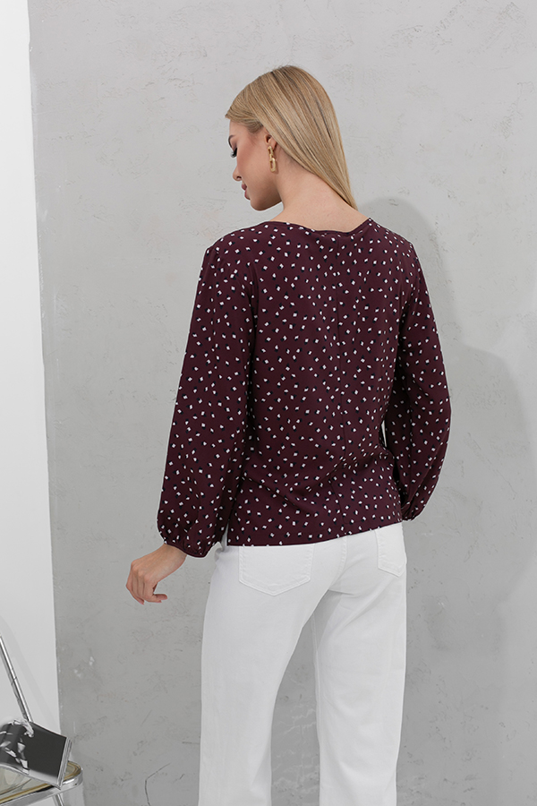 Блуза из блузочной ткани, свободного силуэта. Рукав втачной, снизу присборен и окантован бейкой. V-образный вырез горловины с декоративной завязкой.