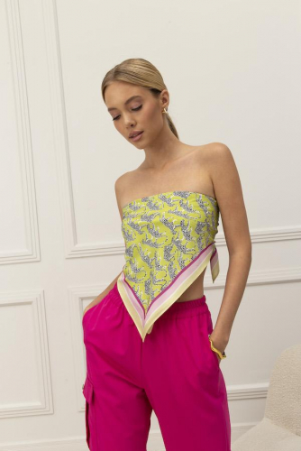 Блуза из блузочной ткани, свободного силуэта. Рукав втачной, снизу присборен и окантован бейкой. V-образный вырез горловины с декоративной завязкой.