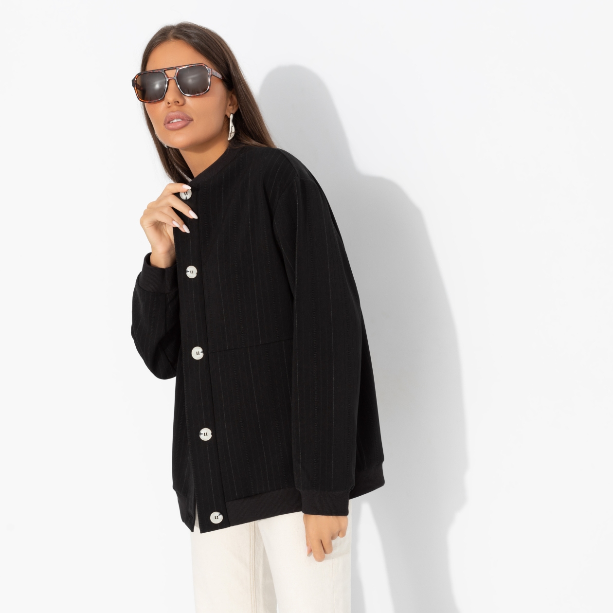Бомбер ЧАРУТТИ – свободный, дерзкий, с намёком на уличный шик, будто бросает вызов обыденности. Он не просит внимания. Он его забирает. Черный бомбер, который требует не скромности, а аплодисментов. Бомбер свободного кроя с карманами.