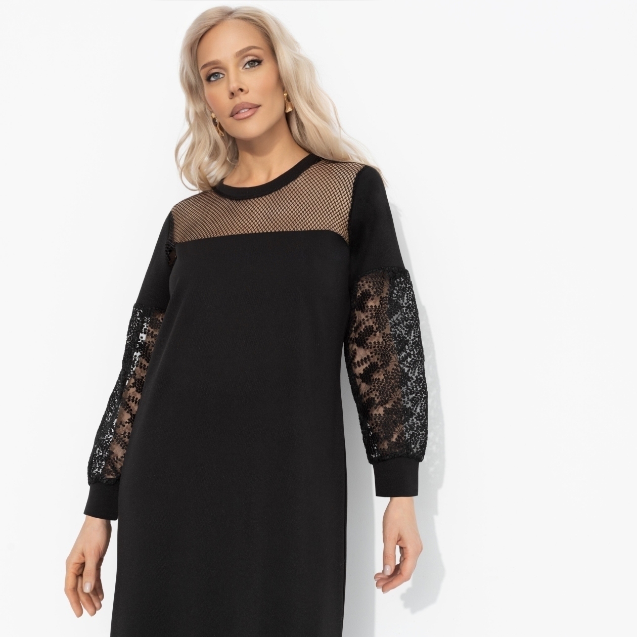 Она отключила телефон. Оставила суету за дверью. Платье из ткани «Диор» с кружевными рукавами мягко ложится по силуэту – и кажется, будто делает ее еще красивее. В отражении зеркала – спокойствие, вкус к жизни и лёгкая интрига. Платье прямого силуэта длины миди с мягкой посадкой по фигуре. Полупрозрачная вставка из сетки и рукава из гипюра-стрейч создают изящный контраст фактур.