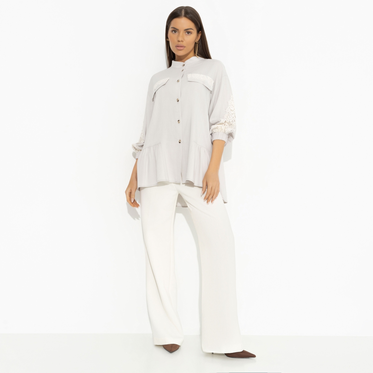 В начале дня важно расставить акценты правильно – зарядка вместо зависания в телефоне, травяной чай вместо кофе и рубашка CHARUTTI вместо всего остального. В ней есть всё – нужный крой, привлекающие внимание детали и нежный цвет. Рубашка свободного силуэта. Рукава и спинка оформлены тонким кружевом. Манжеты оформлены широкой резинкой. Имитация карманов по передней части изделия. Рубашка застегивается на пуговицы.
